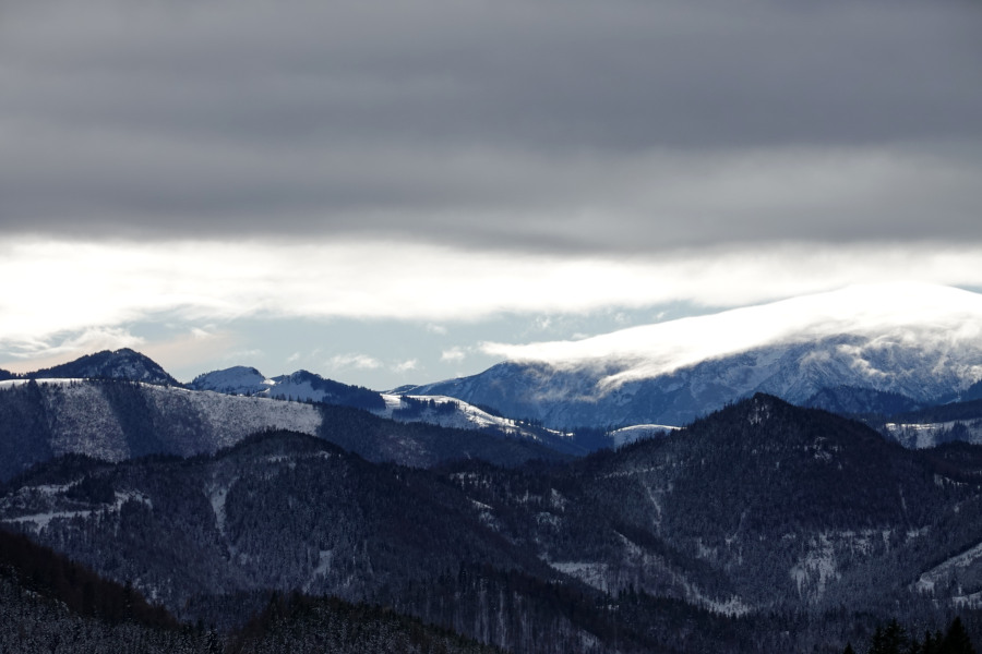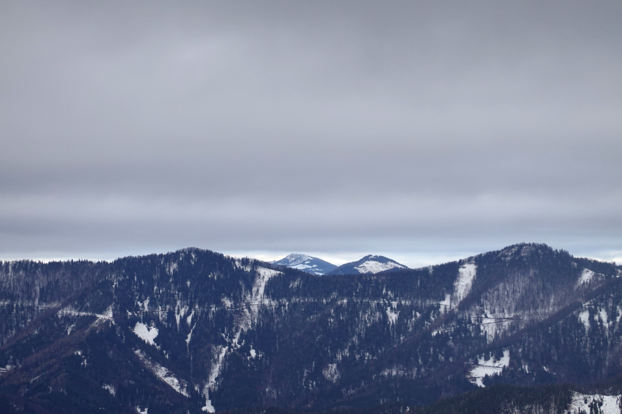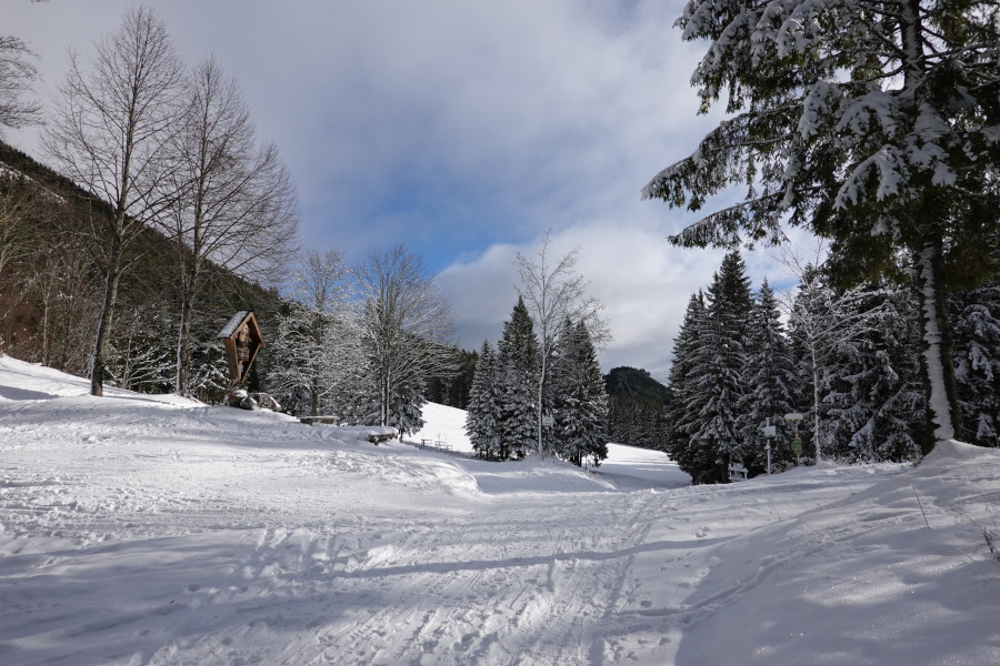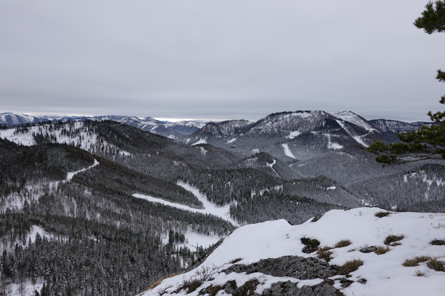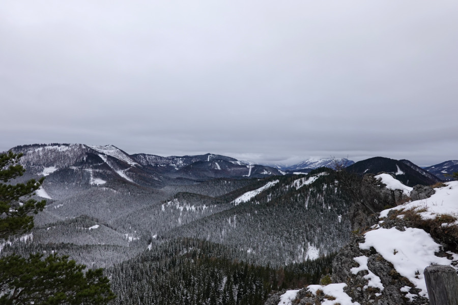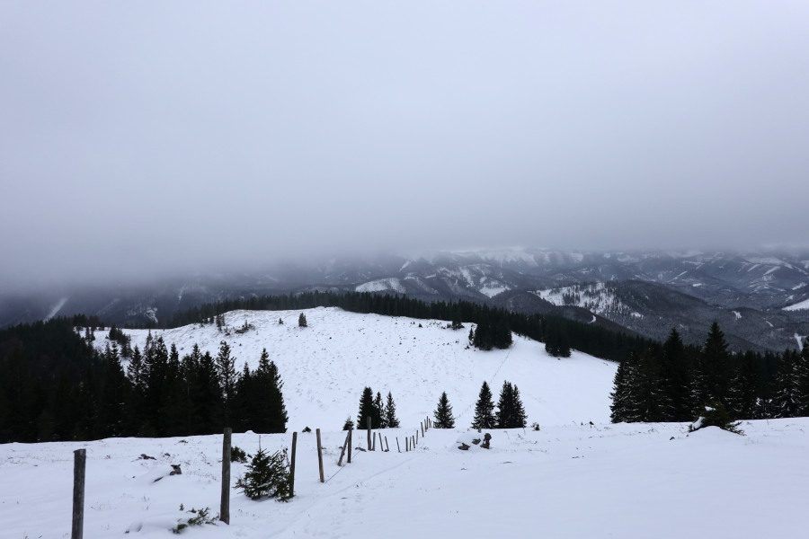Deutlich war die Kaltluftschicht mit dem Schnee auf den Bäumen zu erkennen. Zu diesem Zeitpunkt hatte es auf 1300m rund +2 Grad. In der Früh in Annaberg -10, in manchen Senken wie hier wohl deutlich kälter.