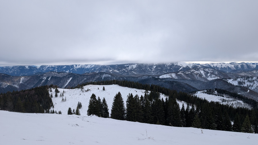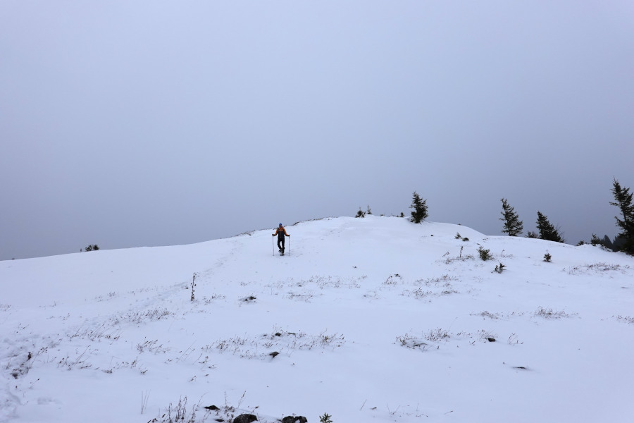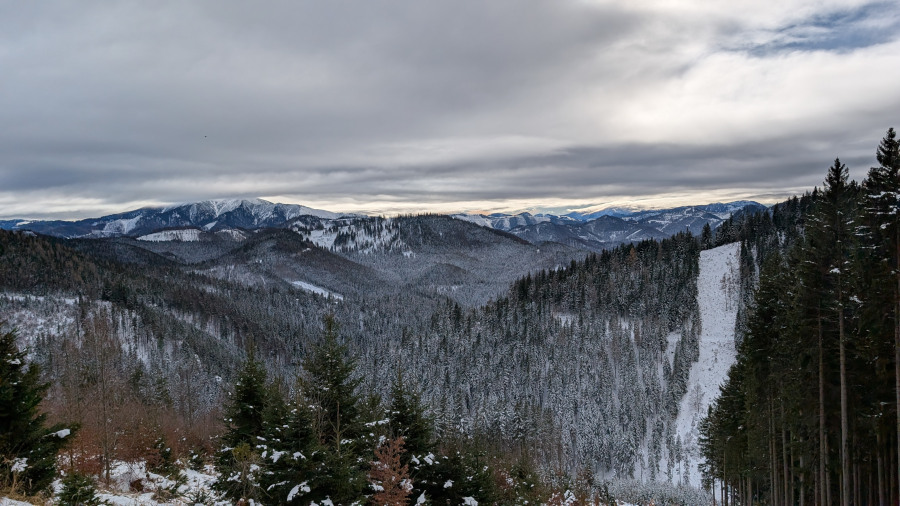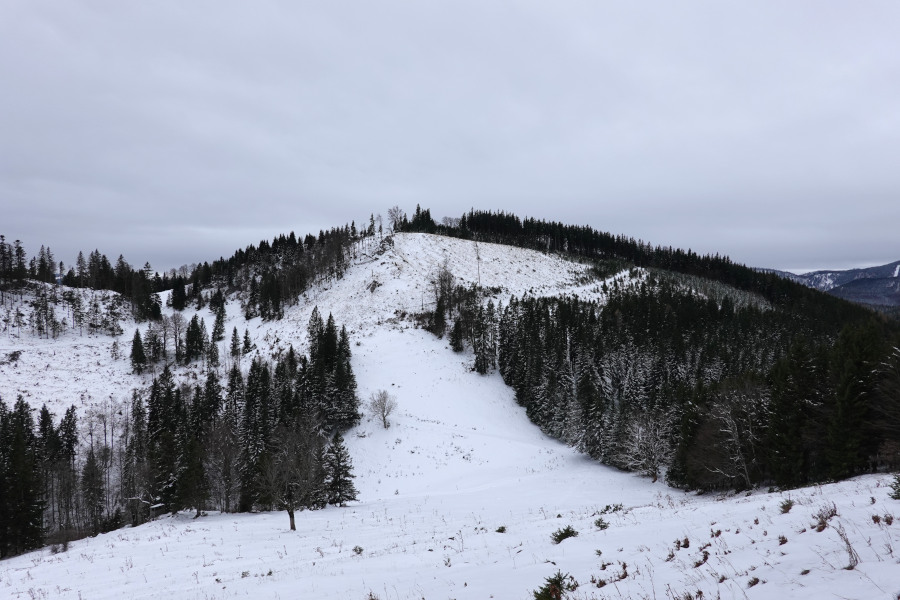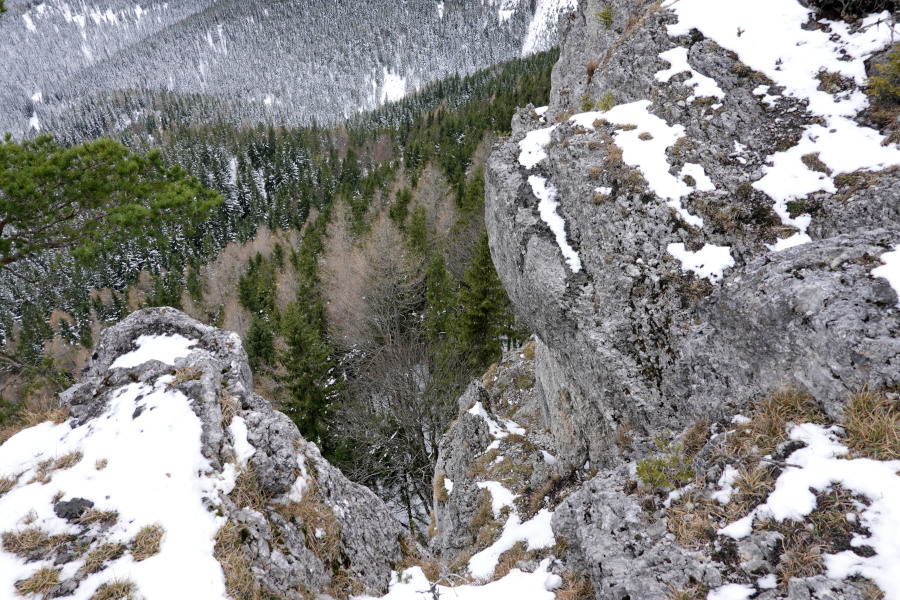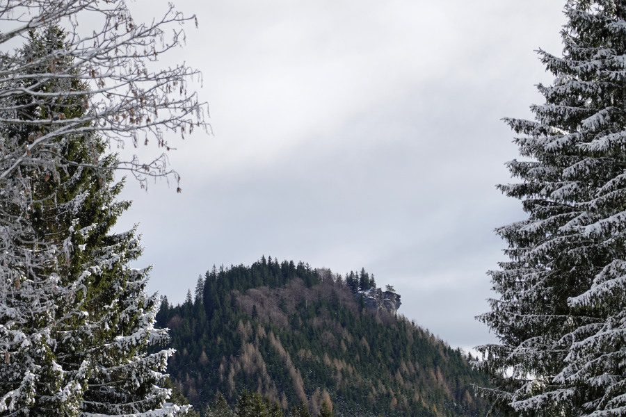Deutlich war die Kaltluftschicht mit dem Schnee auf den Bäumen zu erkennen. Zu diesem Zeitpunkt hatte es auf 1300m rund +2 Grad. In der Früh in Annaberg -10, in manchen Senken wie hier wohl deutlich kälter.