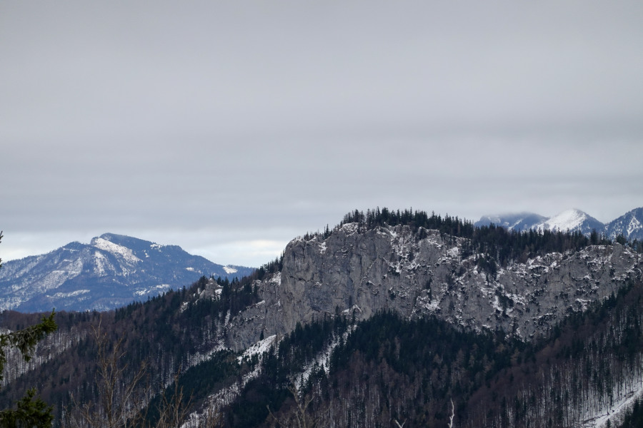 Nach recht genau einer Stunde Gehzeit, zum Schluss den steilen Hang wieder im tieferen Schnee hinauf, erreichten wir den Aussichtsfelsen beim Törlstein (Mini-Gipfelkreuz nicht am höchsten Punkt).