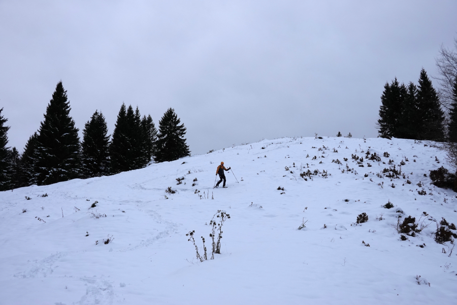Im unteren Teil war die Schneeauflage schon etwas seifig und nicht mehr allzu dick. Mit dem Schneeschuh riss man den gesamten Schnee mit, es fehlte die Unterlage.