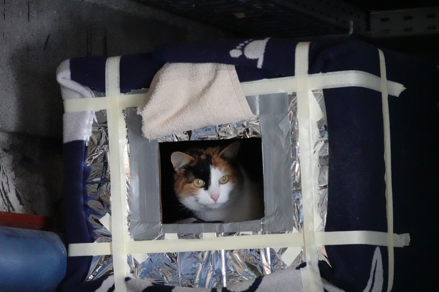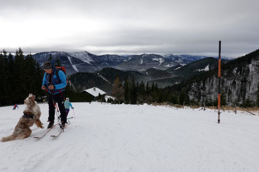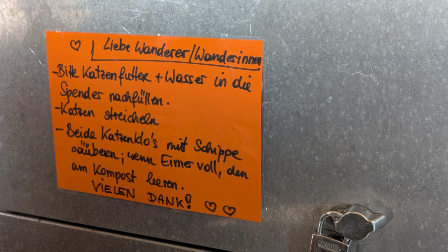 Sehr originell. Leider gestaltete sich das Streicheln schwierig. Durch diverse Hunde saßen die Katzen verschreckt in ihrem vergitterten Kammerl und trauten sich nicht heraus. Im Winterraum waren wir nur kurz alleine, dann kamen mehrere Tourengeher, sowie ein Paar aus dem Gölsental mit Trailrunningschuhen, die nicht damit gerechnet hatten, dass die Hütte zu ist. Sie waren über Eybl und Karnerhofspitze aufgestiegen. Ihre Schuhe waren ziemlich durchfeuchtet von dem nassen Schnee. Ein Anstieg, der mir übrigens ebenso noch fehlt wie die Falkenschlucht. Der Winterraum war voll ausgerüstet, neben Getränken auch ein Ofen und eine Pfanne sowie Tassen und Teekanne. Nur eingeheizt war nicht, daher nur wenige Grad wärmer als draußen.