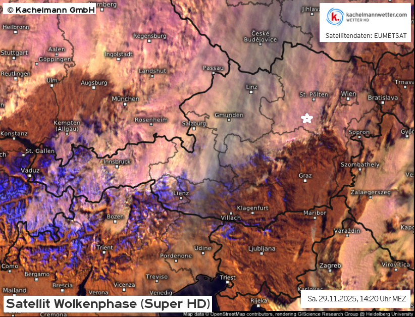 Der auflebende Westwind in der Höhe sorgte kurzzeitig für föhniges Überströmung der Hohen Veitsch (hier mit aufliegendem „Sabel“). Südlich von Hochschwab und Veitsch blieb es wolkenlos, wie auch das Satellitenbild oben zeigt.