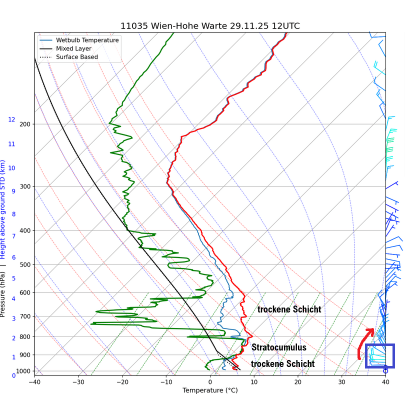 Das Vertikalprofil von Wien um 13 Uhr ist nicht repräsentativ fürs Mariazellerland, dafür liegt es zu weit östlich, aber es zeigt gut die trockene Schicht unterhalb der Stratocumulus-Wolkendecke mit dem Spread von Temperatur (rot) und Taupunkt (grün). Daher die scharfe Untergrenze. Zudem sieht man den mäßigen Westwind (blaues Kasterl) und die Rechtsdrehung des Windes mit der Höhe (von West auf Nordwest), also Warmluftzufuhr.