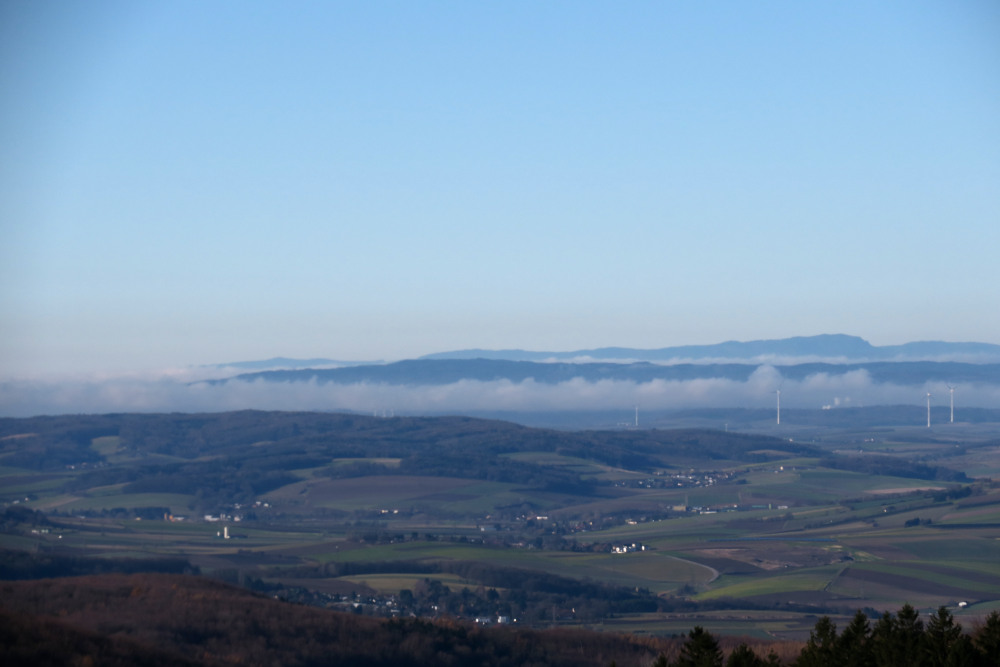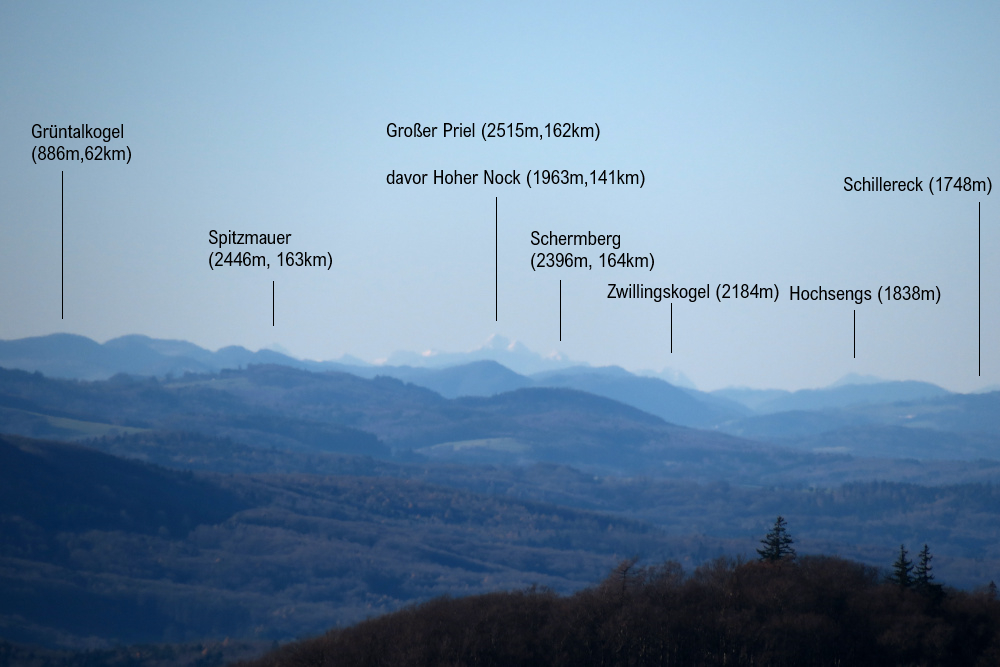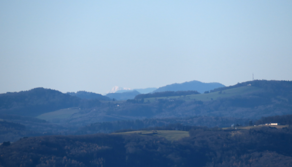 Etwas weiter rechts wäre wahrscheinlich sichtbar noch der Traunstein gestanden (er steht dort immer noch), aber die schwankende Warte verhinderte, dass ich genau gezoomt scharfstellen konnte.