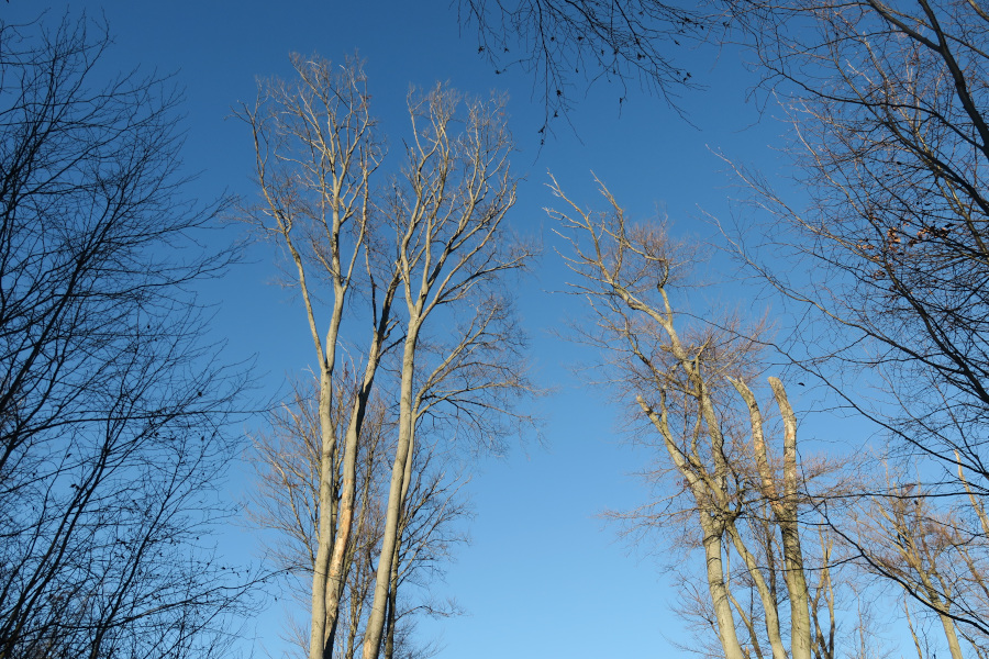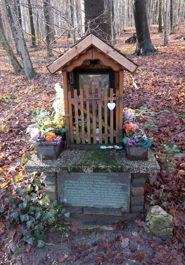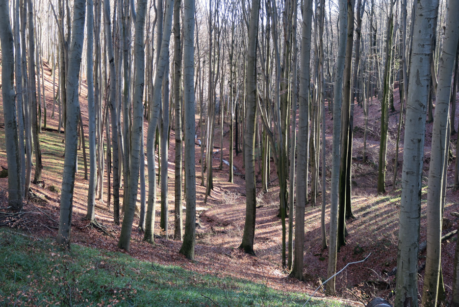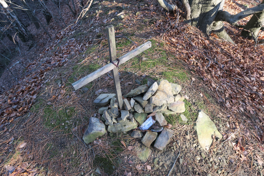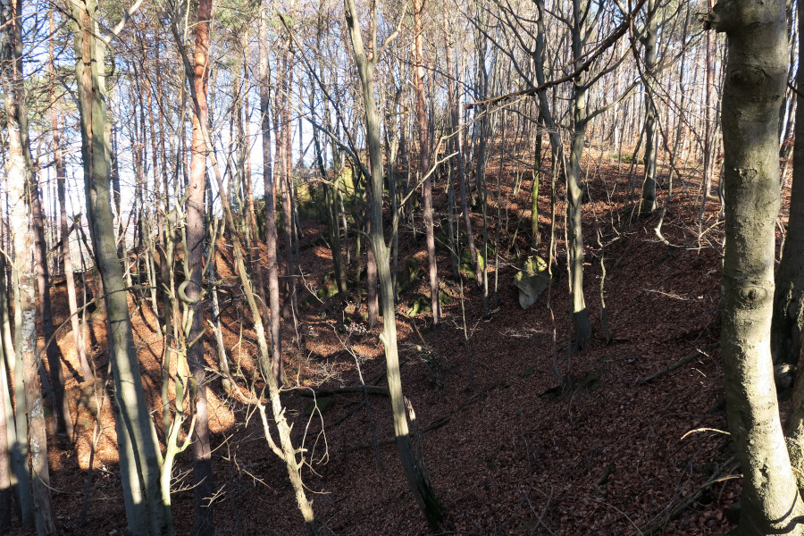 Also wieder hinauf, womit ich nun aber nördlich vom Buchberg wieder auf den Höhenweg kam und damit einen ziemlichen Umweg hatte. Bei der großen, ebenen Kreuzung zwischen Buchberg und Rehgrabenberg befand sich übrigens von ca. 1930 bis 1960 das „Gasthaus am Hannbaum“ (alte Aufnahmen).