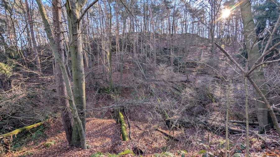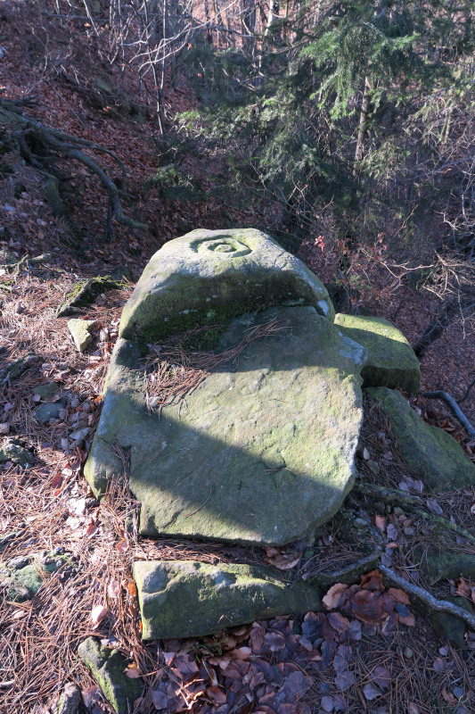 Bei einer großen Wegkreuzung verließ ich die markierte Route und folgte einem Steiglein nach Osten, das sich mehrmals aufteilte. Wahrscheinlich eine beliebte MTB-Route. Womit ich nicht gerechnet hatte, waren die tief eingeschnittenen Mulden und Gräben mit großen Sandsteinblöcken.