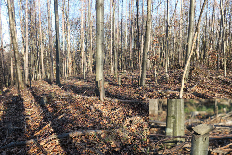 Nach einer kurzen Rast am Fuß der ersten Aussichtswarte betrat ich Neuland, indem ich nach Osten weiterging. Bereits im Jahr 1820 wurde hier vom Forstpersonal ein einfacher Steigbaum mit Sprossen errichtet und 1830 ein Schaugerüst. Von 1962 bis 1991 gab es zudem eine Betonsäule mit Wendeltreppe und Plattform in zwanzig Meter Höhe, die 1985 wegen diverser Schäden gesperrt und 1991 abgerissen werden musste. Faszinierend finde ich diese alten Aufnahmen der ersten Warte mit der seit 1900 betriebenen Schutzhütte auf dem baumlosen Gipfel.