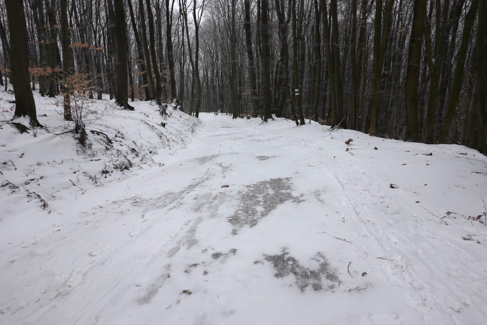 Beim Aufgang zur Kanzel beim Leopoldsberg legte ich meine Spikes an (Snowline Chainsen XT), da sich unter der dünnen Pulverschneeauflage eine spiegelglatte Eisschicht befand. Das galt für fast die gesamte Strecke auf den Asphalt- und Forstwegen.
