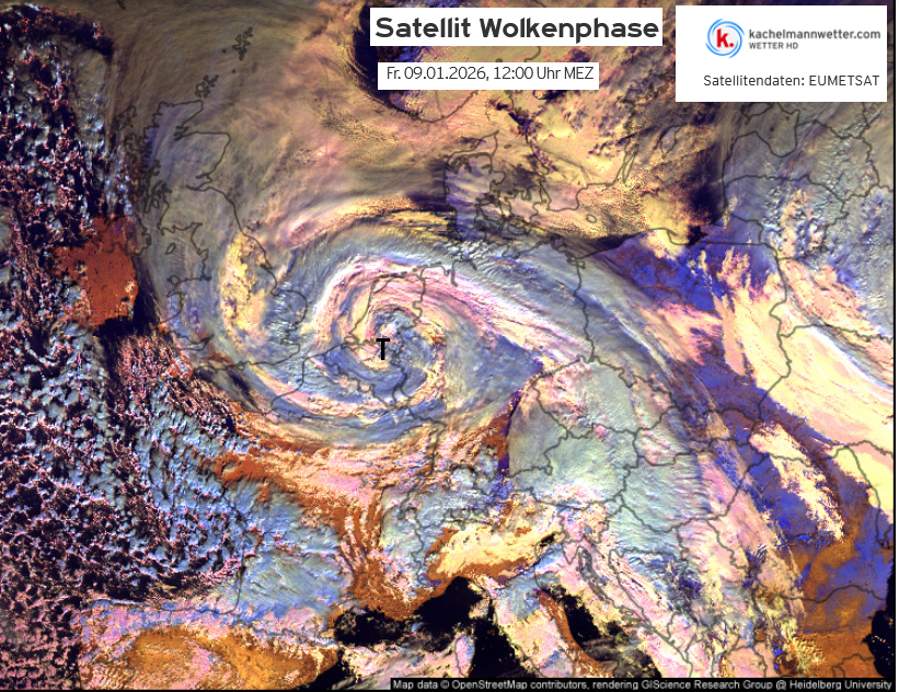 Der Frontenprozess bis dahin ist durchaus interessant, er zeigte am Vortag eine ausgeprägte „split front“. Dabei „überrennt“ die trockene Höhenluft der Kaltfront die Warmfront, sodass nurmehr die tiefe Bewölkung übrig bleibt (Donnerstag, 08.01., 22.30 Uhr MEZ). Der Warmfrontbereich wird immer schmaler (Freitag, 09.01., 04.40 Uhr MEZ) und liegt strömungsparallel über den östlichen Alpen (09.00 Uhr MEZ). Am Nachmittag wird das Bild etwas komplexer, weil sich über Italien ein Teiltief bildet und damit eine Verwellung der Front auslöst (14.10 Uhr MEZ).