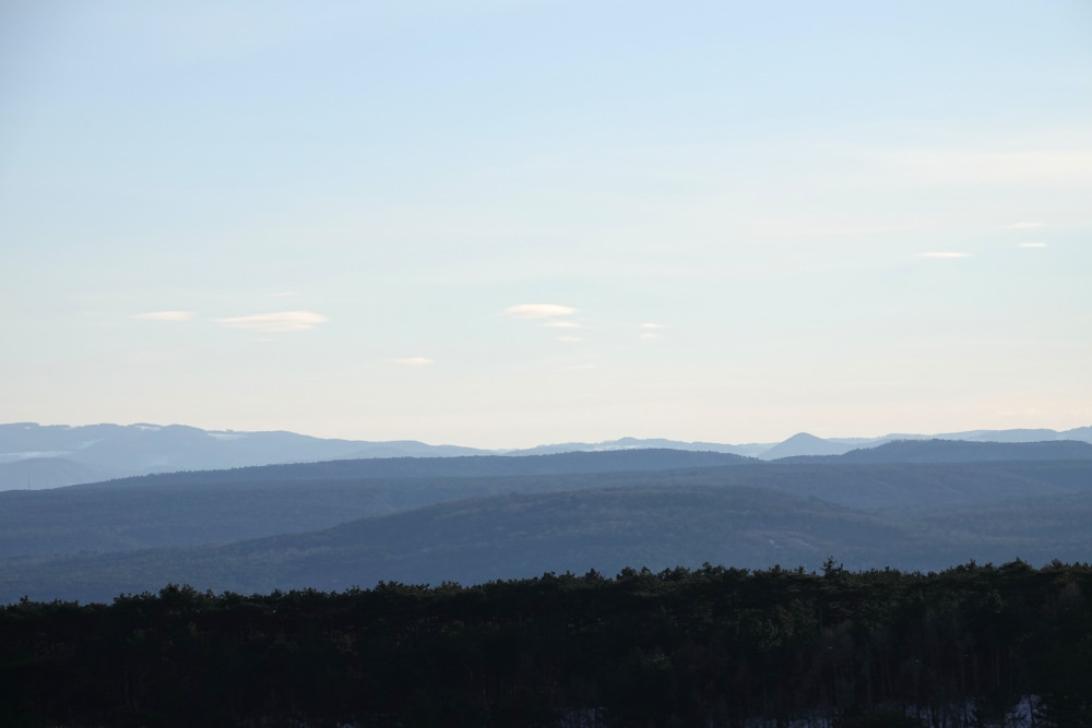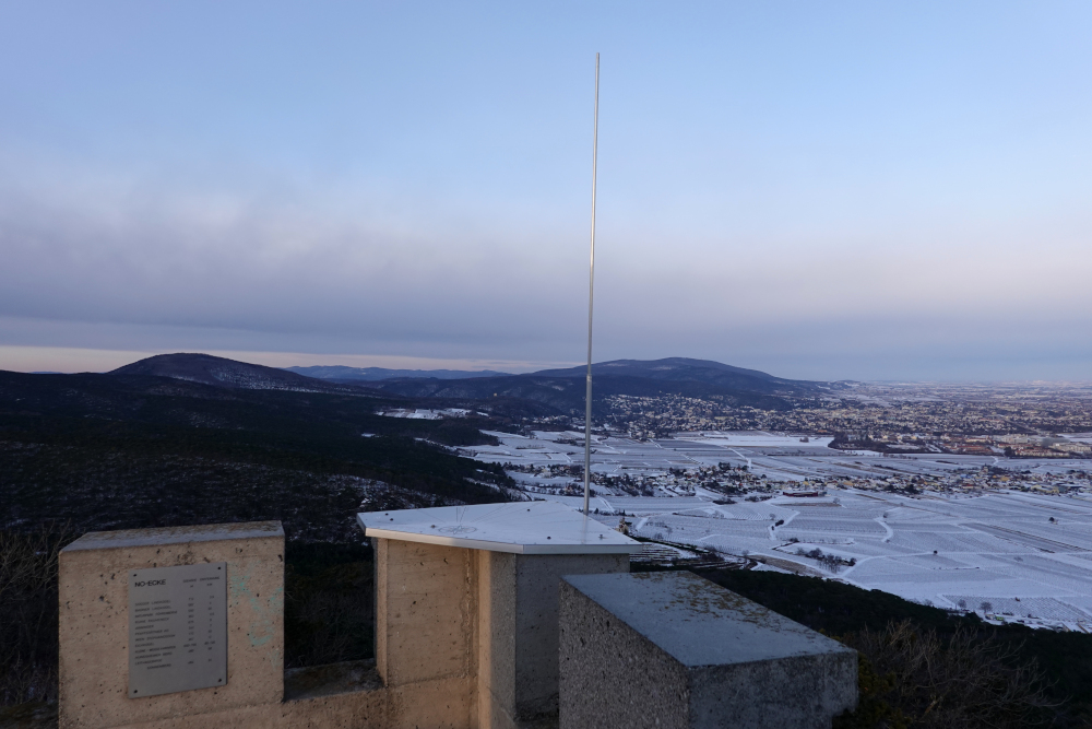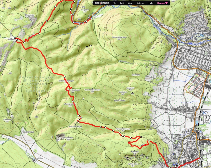 Wegführung: Helenental Cholerakapelle (11.20) – Steiniger Weg – Hoher Lindkogel (834m, 12.50-13.15) – Hinterer Lindkogel (702m, 13.50) – Sooßer Lindkogel (713m, 14.05) – Jubiläumskreuz (14.35) – Pecherhütte – Harzbergturm (466m, 15.35) – Bad Vöslau Bf (16.26) | 800hm, 16.8km, ca. 4 Std. 15 Minuten reine Gehzeit