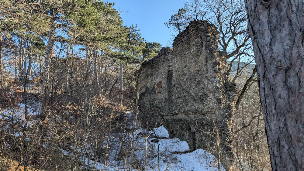 Hinter der ehemaligen Zementfabrik steigt der markierte Steig über die Ruine zum Kamm auf. Nun in der vegetationsfreien Zeit sah man die alten Gemäuer besser. Sie stammt vermutlich von Chemerstain, nach Otto II. von Perchtoldsdorf („Kämmerer von Österreich“) und wurde um 1240-50 erbaut und 1286 bereits zerstört.