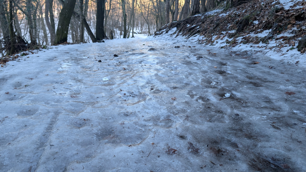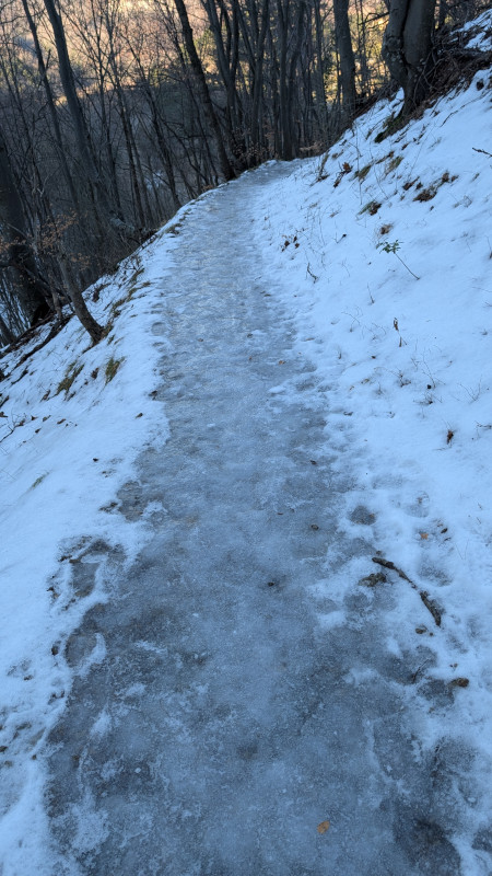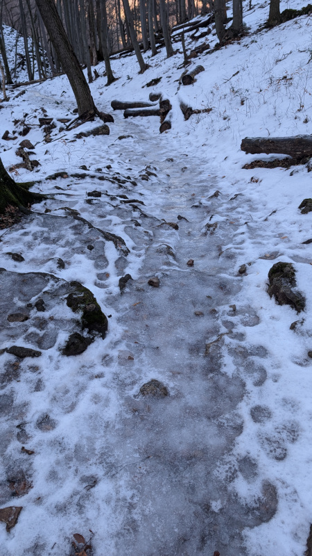 Das folgende Forstwegstück wies den dicksten Eispanzer auf, den ich je gesehen habe. Ohne mehrzackige Zacken keine Chance.