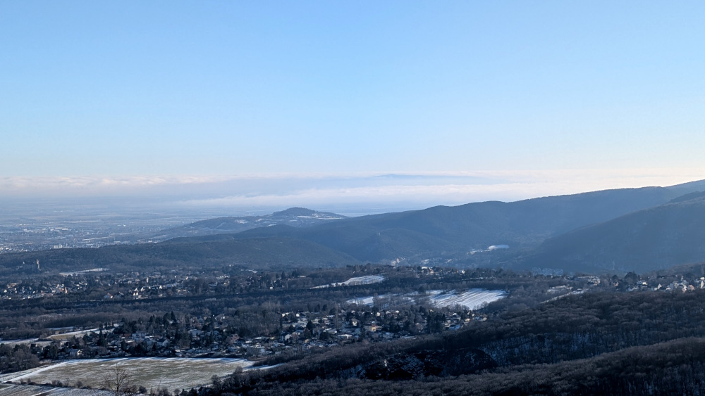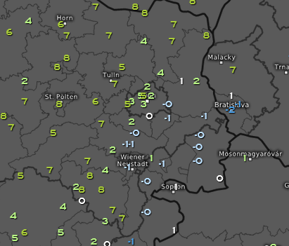 Bis ich in Rodaun starten konnte, wanderte der Nebel schon vom Seewinkel bis Wiener Neustadt herein. Damit verbunden ein deutlicher Temperaturrückgang. In den Nebelgebieten herrschte Dauerfrost mit -1 bis -2°C, in den sonnigen Regionen entlang vom Wienerwald milde 6 bis 8 Grad. Entsprechend ein Druckgefälle zum Alpenostrand hin von 2-3hPa auf rund 50km Entfernung.