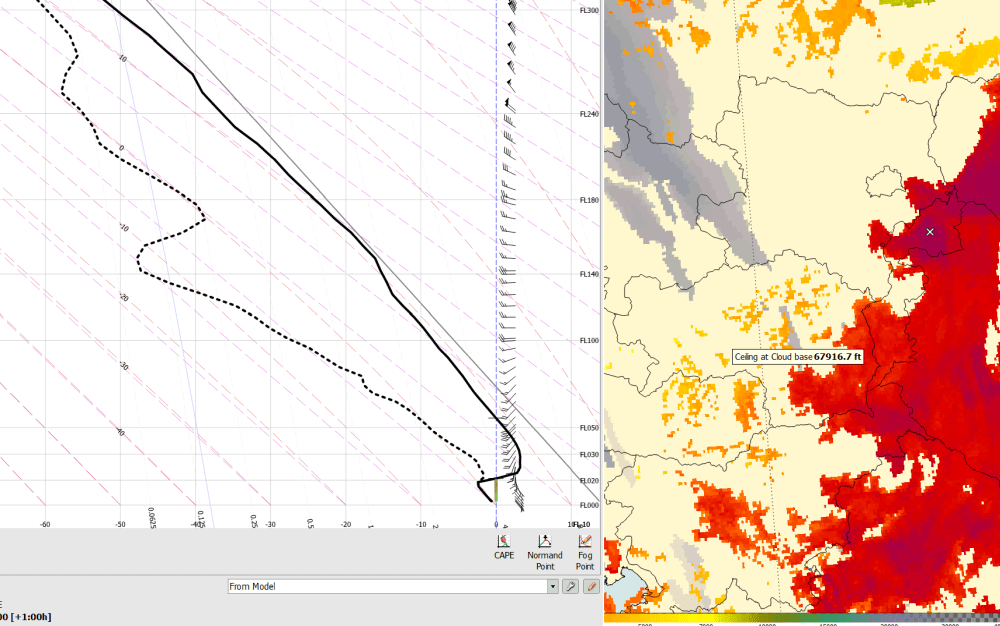 Der Vorhersageaufstieg, der repräsentativ für das Nebelgebiet ist, zeigt eine scharfe Inversion in 2000ft amsl (ca. 600m Höhe), darunter schwacher Südostwind, darüber zunehmender Südwestwind. Eine dritte Möglichkeit für ausfallenden Niederschlag sind Kelvin-Helmholtz-Wellen durch die vertikale Windzunahme und wärmere Luft über kälterer Luft, möglicherweise waren mehrere Niederschlag bildende Prozesse beteiligt.
