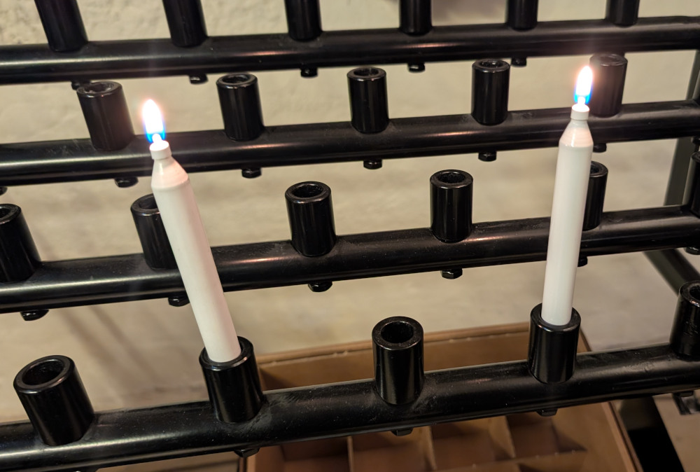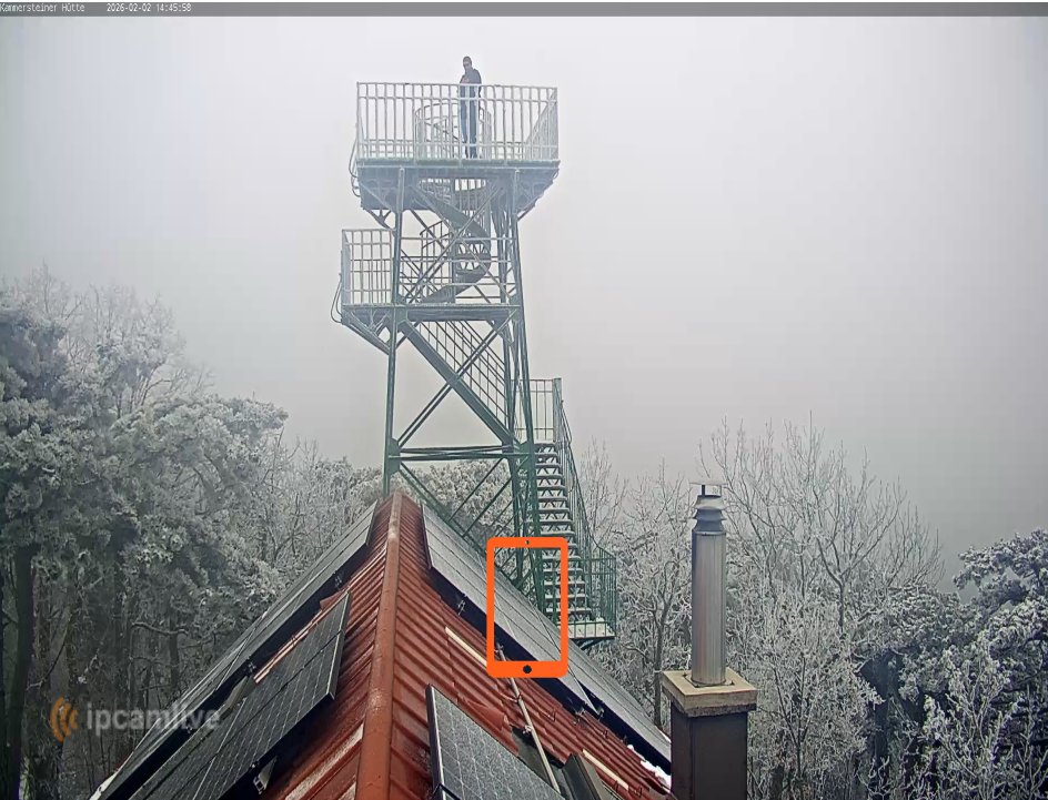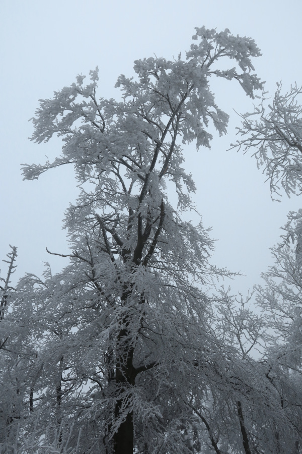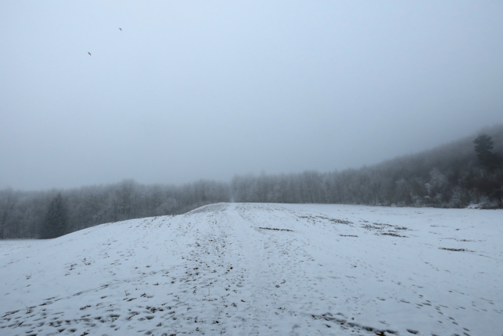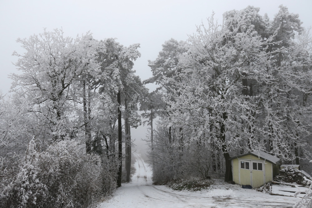 Bereits am Weg dorthin schien mir der Nebel zeitweise heller zu werden. Es ist ein ganz spezifisches Graublau, was ich schon öfter beobachtet hatte, bevor sich der Nebel auflöste. Beim Höllensteinhaus traf ich niemanden, der Vorraum war aber naturgemäß offen und so verzehrte ich meine belegte Semmel und trank ein Murauer Jubiläumsmärzen dazu. Drinnen brannte Licht und es glühte rot im Ofen. Erst beim Gehen, als ich nochmal durch das Fenster in den Schankraum blickte, weckte ich offenbar die Wolfshündin aus ihrem Mittagsschlaf