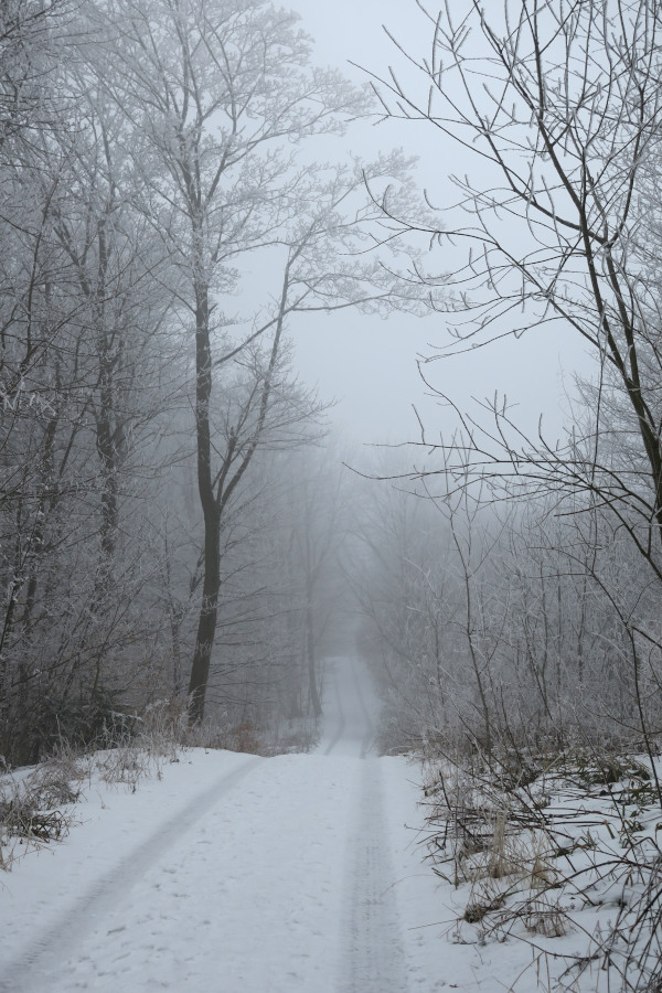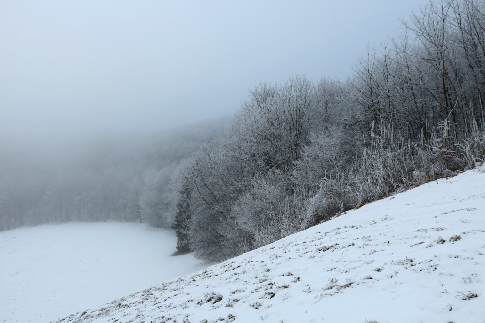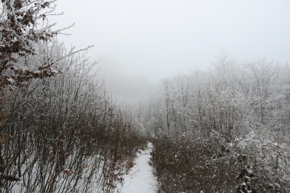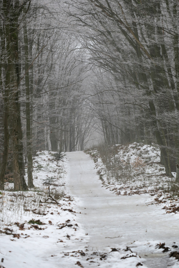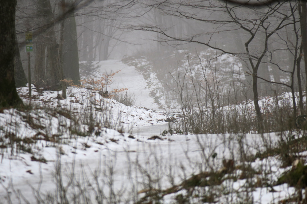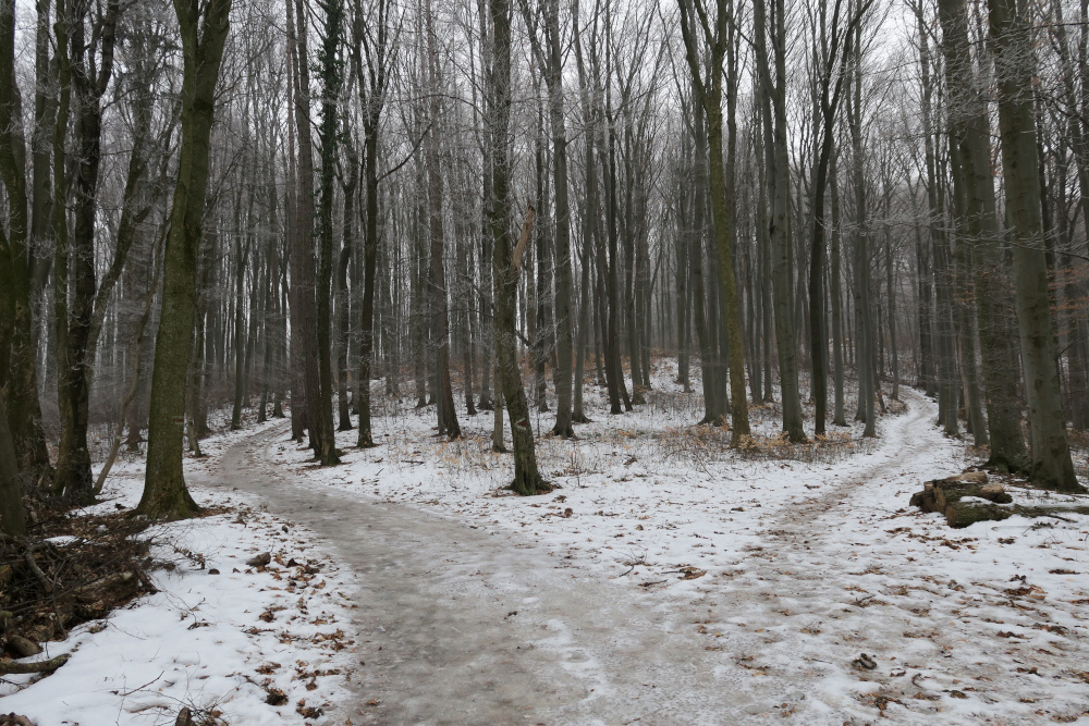 Ab etwa 450m Höhe lag eine dünne Neuschneedecke. Spikes hätte man jetzt nicht mehr gebraucht, aber ich traute mich nicht, sie auszuziehen. Richtung Perchtoldsdorf sollte es wieder eisiger werden.