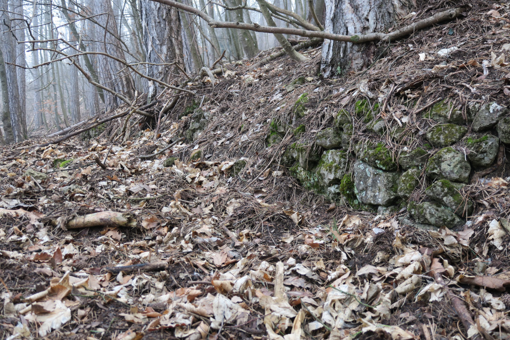 Laut OSM waren Wege vorhanden, die aber offenbar mindestens seit dem Starkregen im September 2024 nicht mehr gepflegt wurden. Teilweise war der Hang abgeruscht, teils lagen Bäume quer über dem Weg. Hier und da schauten Mauerreste von Wegbefestigungen durch.