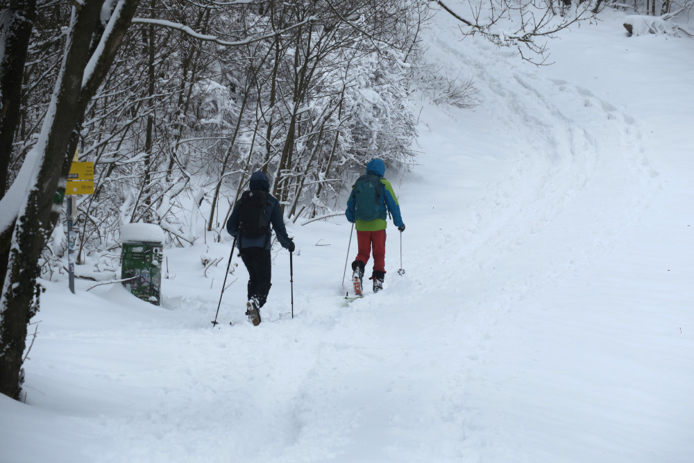Am tiefsten Punkt standen zwei Wanderer mit Gamaschen. „Schau, da ist jemand noch professioneller unterwegs“ , sagten sie im Vorbeigehen. Ab dem Kahlenberg sah ich die erste Tourenskispur.