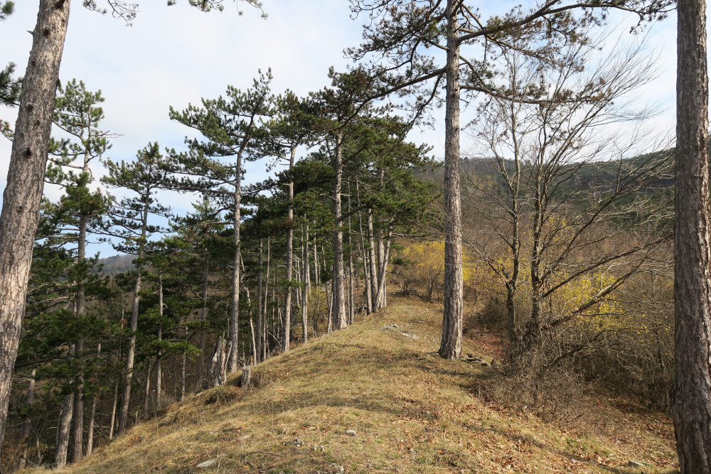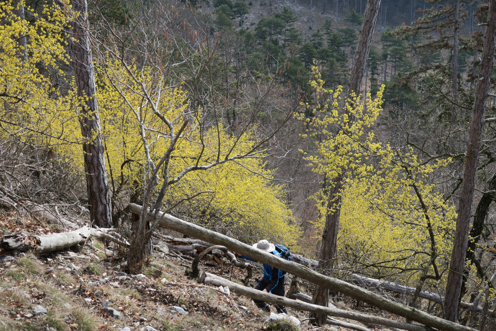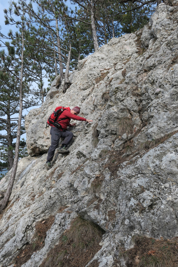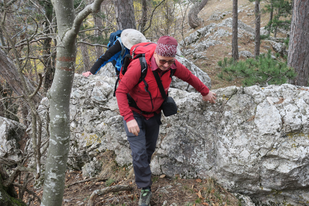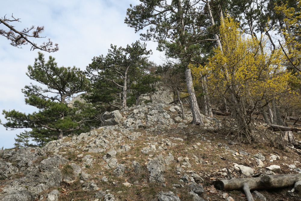 Dort ein paar Meter auf der Straße (bzw. daneben) und beim Haus mit dem Hundegebell rechts einen Forstweg hinauf. Bald standen wir am Beginn des Süßwandgrats oberhalb der „Roten Schale“.