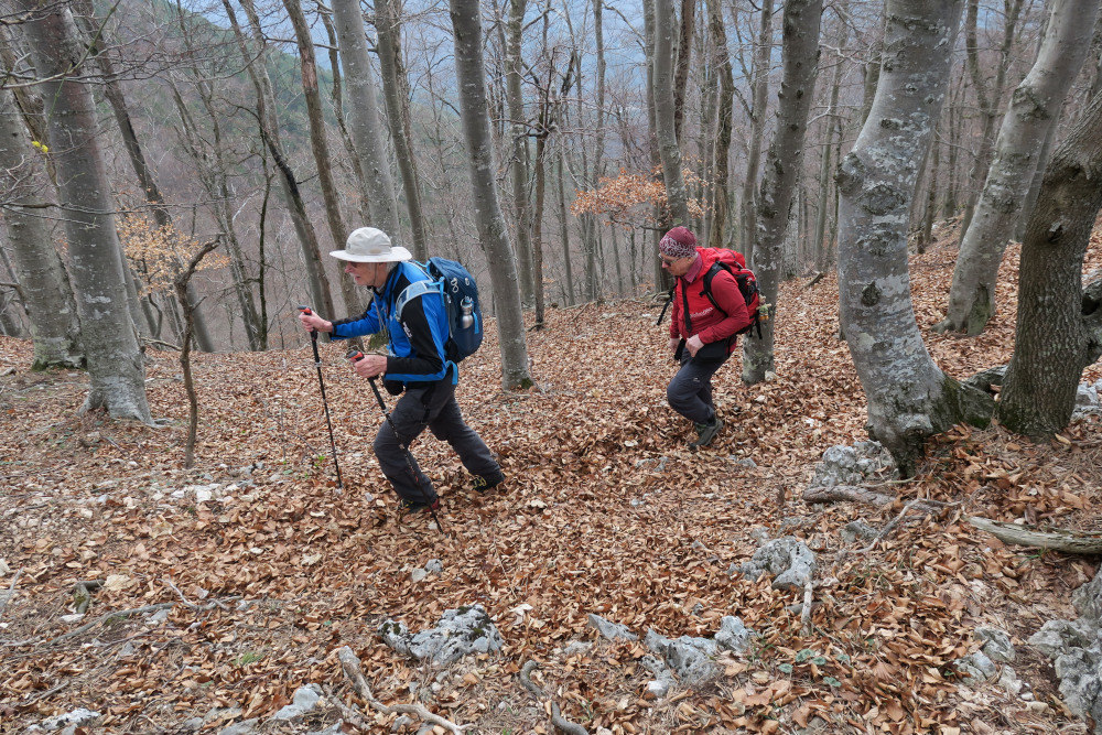 Der erste Felsaufschwung wird rechts umgangen. Günter versucht die direkte Überschreitung (I+). Das sah zwar kraftraubender aus, war in gewisser Weise wohl einfacher als in der lockeren, bröseltrockenen Steilerde aufzusteigen.