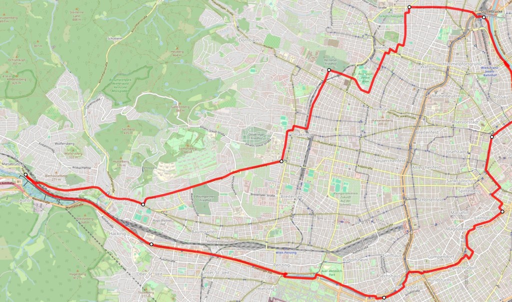 Ein weiteres Schmankerl sind Baustellen ohne Umleitungen und „Radweg endet!“-Abschnitte. Beim Wilhelminenspital musste ich auf den Gehsteig wechseln, um dann wegen einer Baustelle keinen legalen Weg auf den Flötzersteig vorzufinden. Der Gehweg war dann am Ende abgesperrt und ich zwängte mich zwischen den parkenden Autos durch und dann auf den Radstreifen. Den Flötzersteig fuhr ich erst das zweite Mal, zuletzt am 7. August 2020. Ähnlich wie damals knallte die Sonne auf den Asphalt, aber die anschließende Abfahrt zur Linzer Straße war dann schön. Dieser folgte ich bis zur Schnellbahn-Station Wolf in der Au. Dort vermied ich das Harakiri, in die Abfahrt zum Wienfluss abzubiegen und fuhr bis zum nächsten Zebrastreifen, um zu drehen.