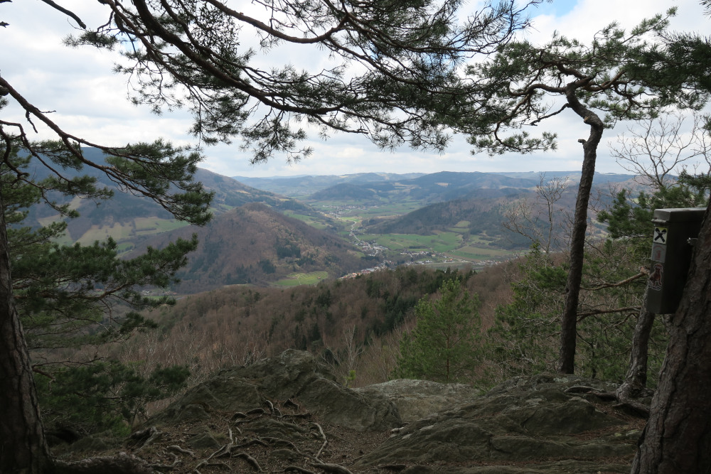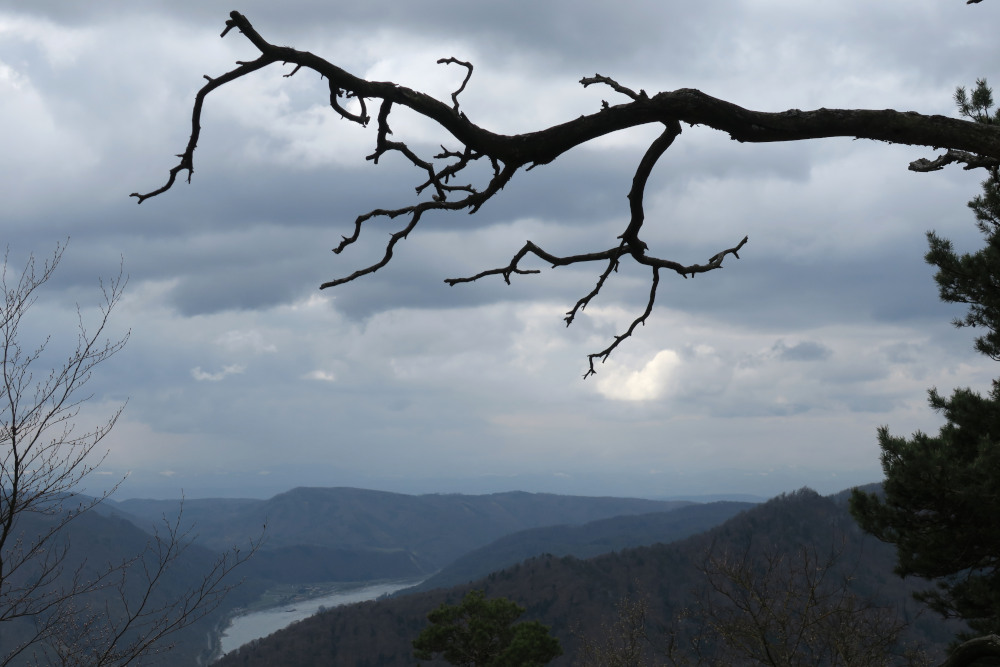 Vom Aussichtsplatzerl unterhalb des Gipfels schaut man in die zentrale Wachau, im Hintergrund setzt sich deutlich der Klausberg (571m) im Dunkelsteinerwald ab. Im Hintergrund dunstig mit verschneiten Voralpen.