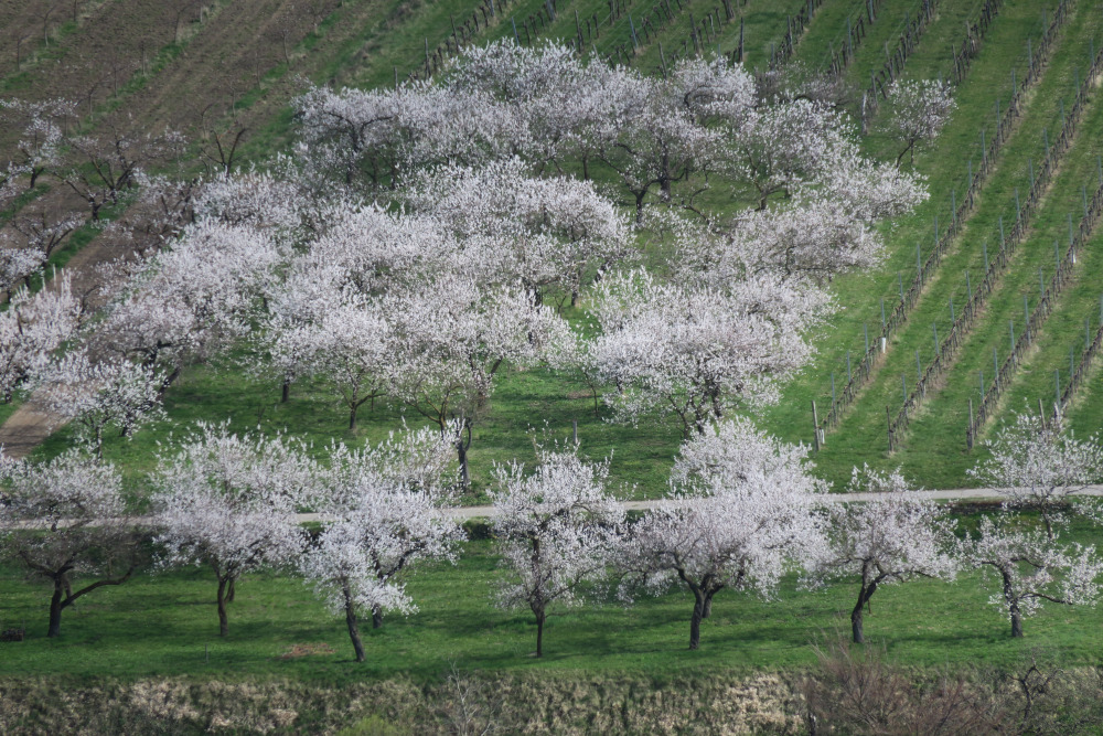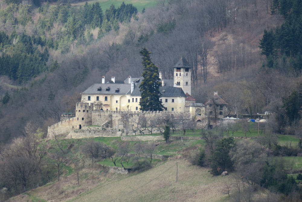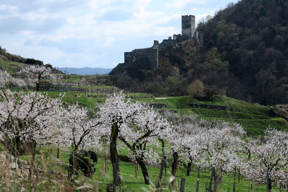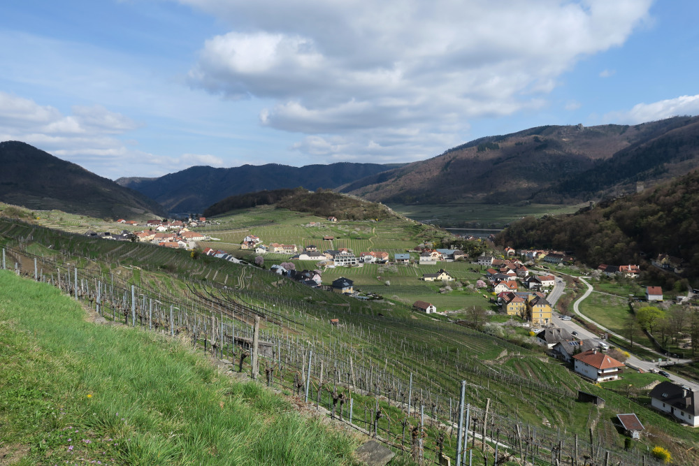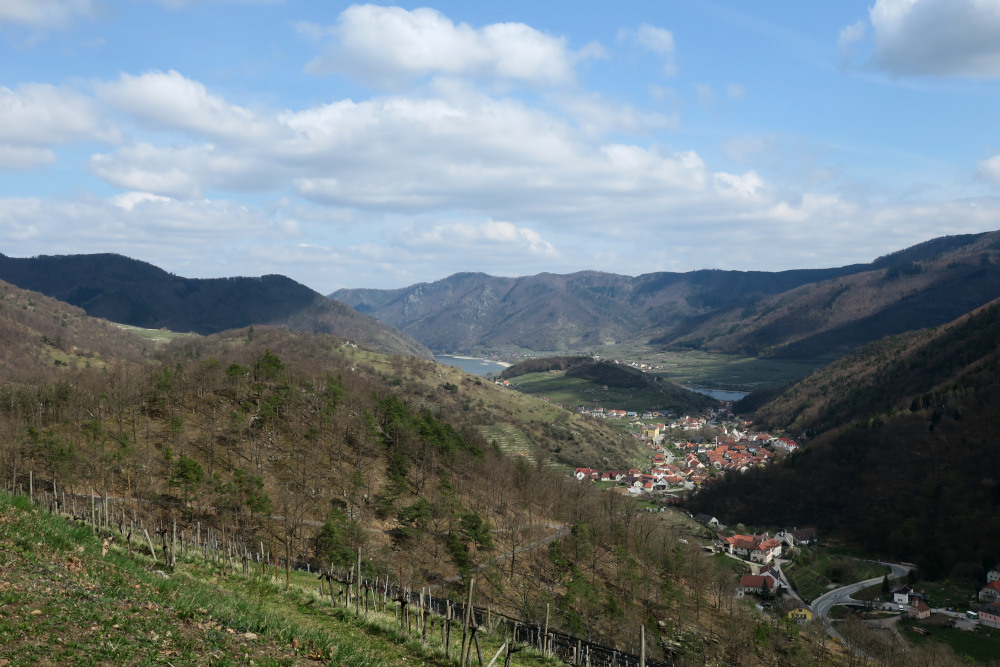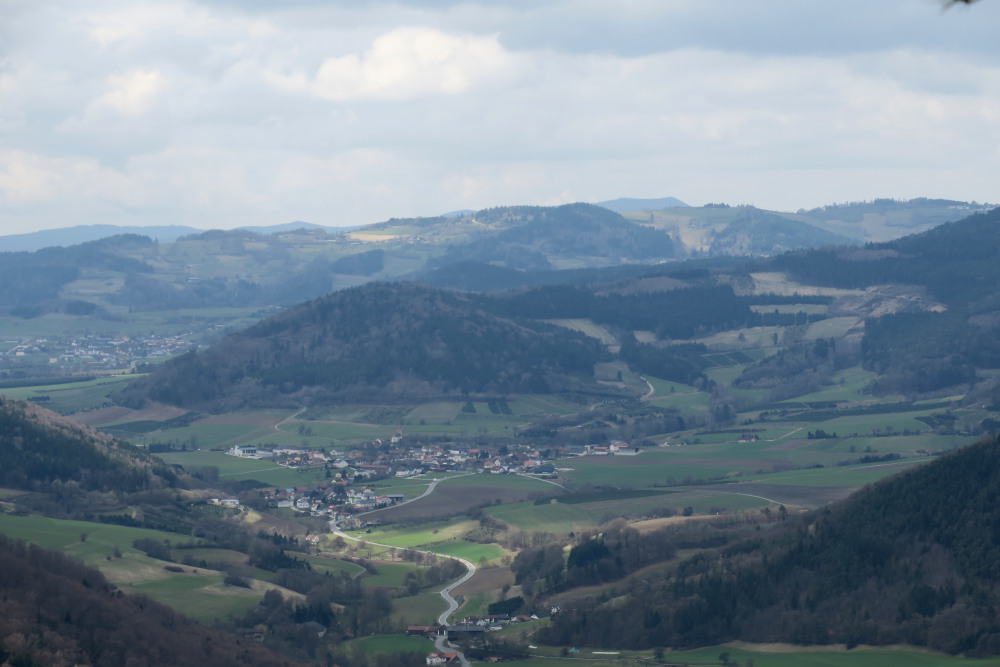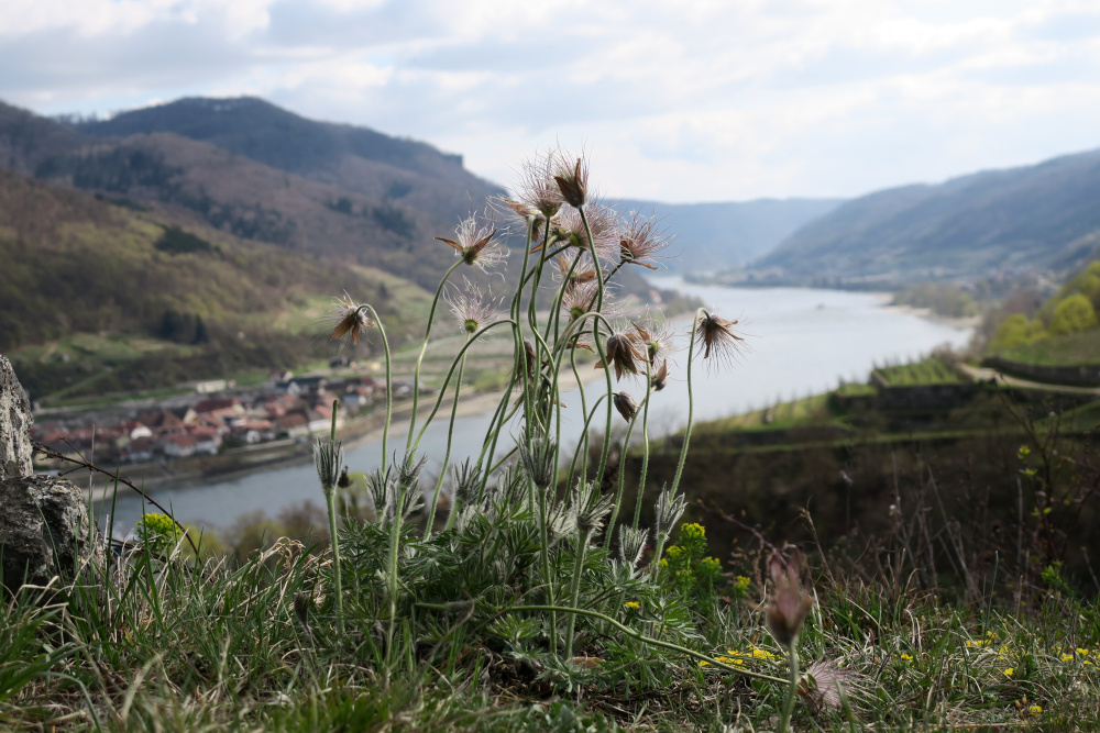 Bei einem Bankerl am Waldrand blickte ich das erste Mal zurück: Im Tal blühten schon Marillen und Kirschen, im Wald war die Vegetation noch im ausklingenden Spätwinter zugegen, mit Leberblümchen, Pestwurz und zahlreichen Himmelsschlüsseln (Primula veris). Insbesondere Pestwurz blüht gerne kurz nach einer abtauenden Schneedecke.