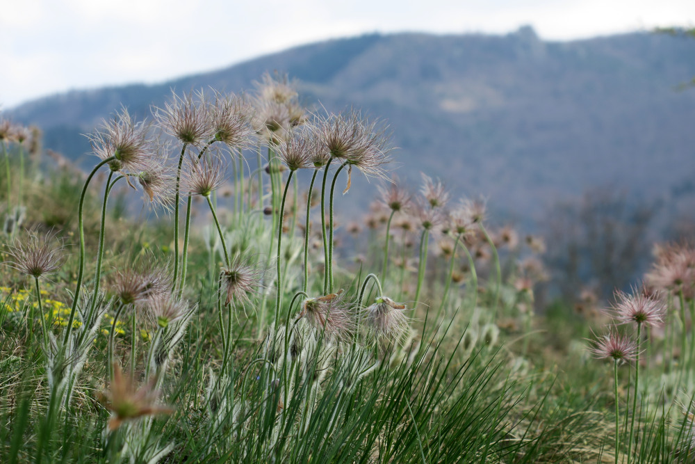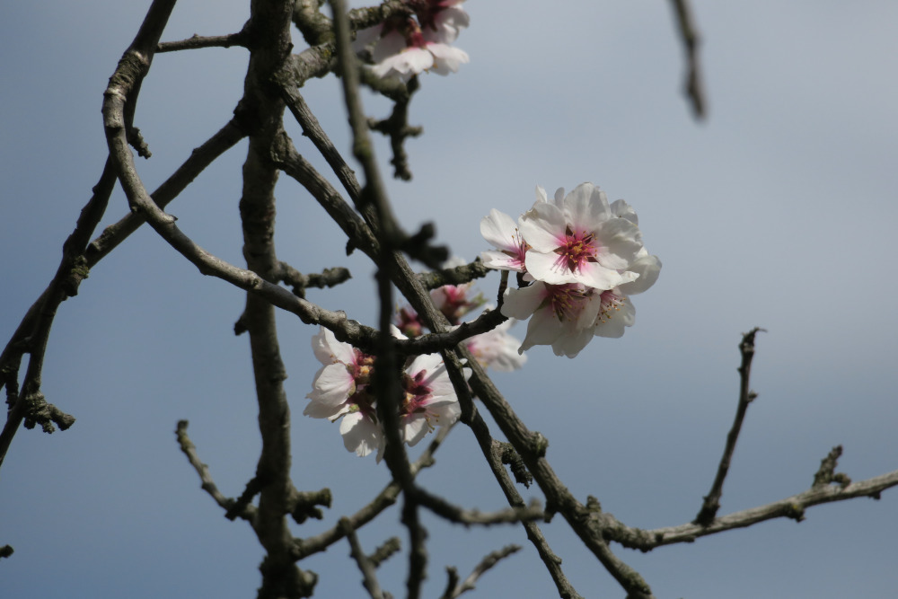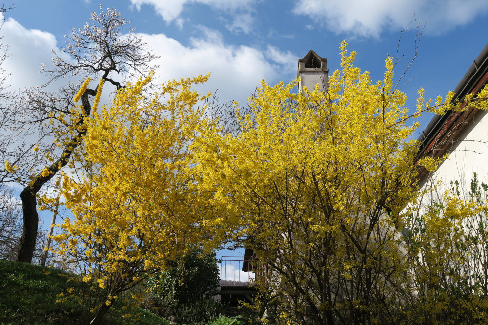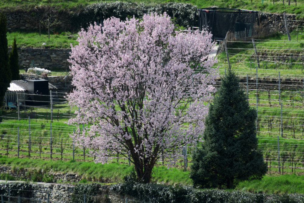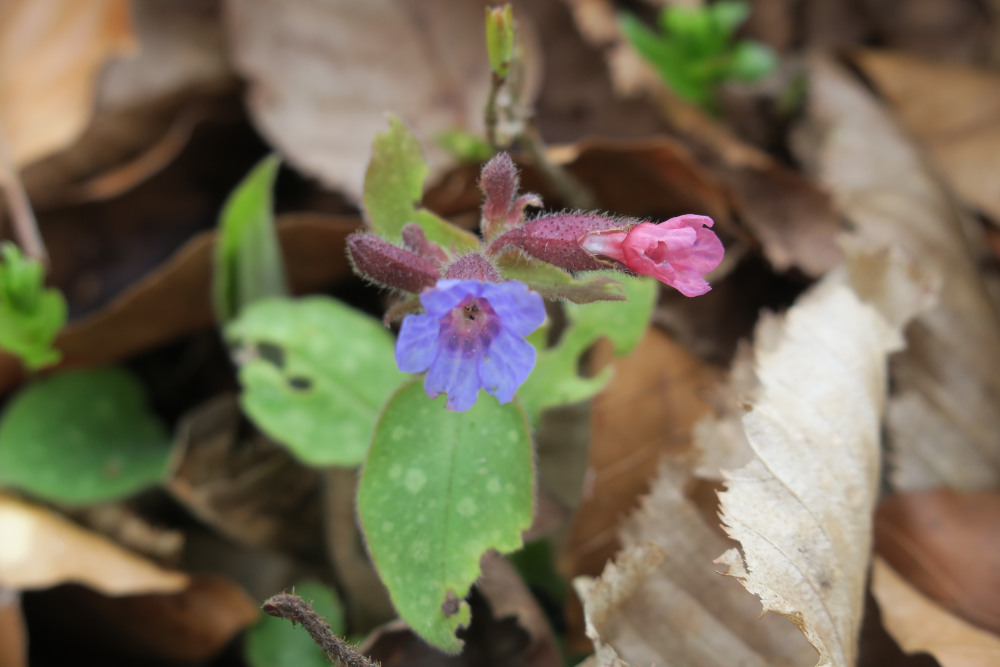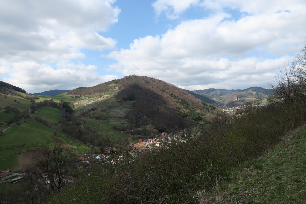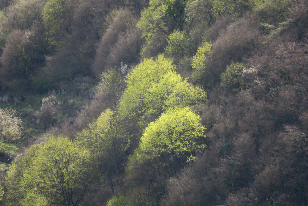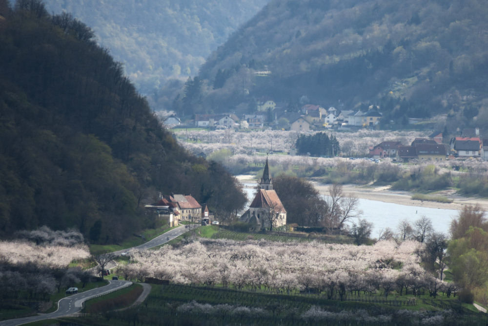 Bei einem Bankerl am Waldrand blickte ich das erste Mal zurück: Im Tal blühten schon Marillen und Kirschen, im Wald war die Vegetation noch im ausklingenden Spätwinter zugegen, mit Leberblümchen, Pestwurz und zahlreichen Himmelsschlüsseln (Primula veris). Insbesondere Pestwurz blüht gerne kurz nach einer abtauenden Schneedecke.