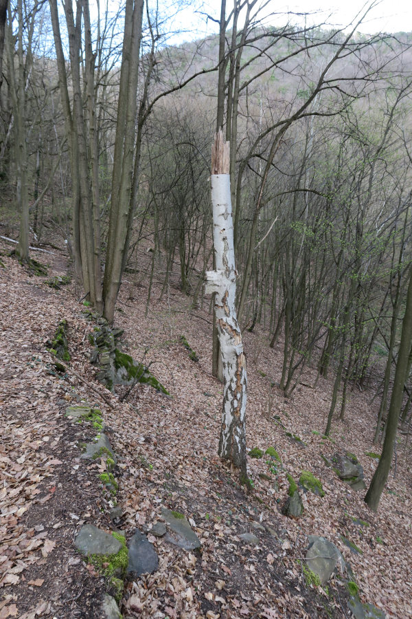 Unabsichtlich folgte ich bei der zweiten Kehre am Zornberg dem oberen Steig, der sich bei einem Rücken mit Trockenrasenansatz etwas verlor, bzw. waren die gelben Schilder teilweise abgebrochen. Ich brauchte zwei Anläufe und den Detailblick in die OTM, um festzustellen, dass meine Karte hier veraltet war. Es ging tatsächlich steil hinab in einen Graben, hier definitiv nicht mehr radtauglich.