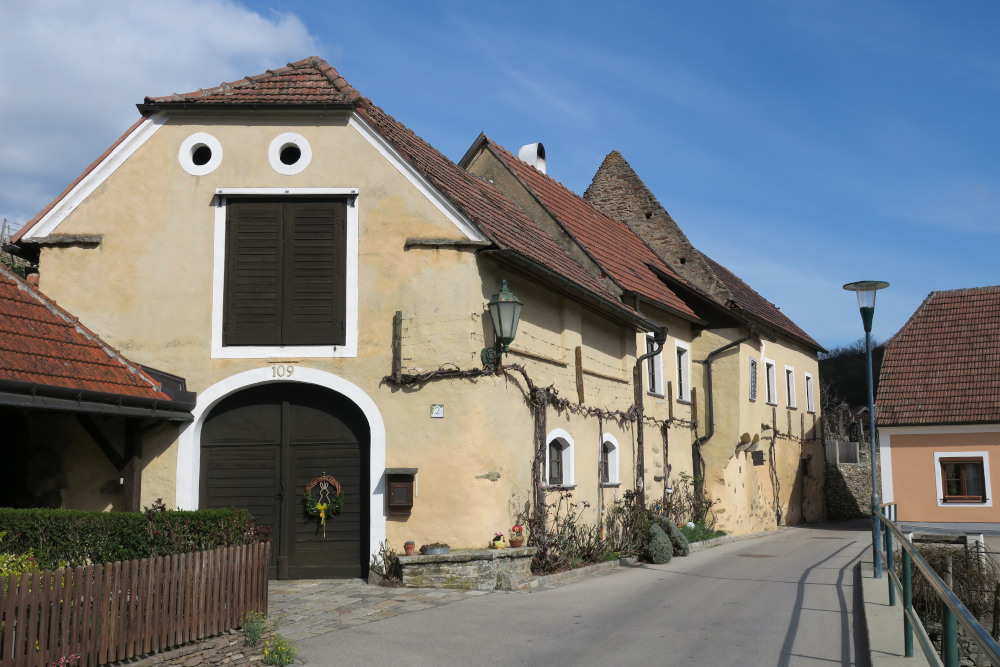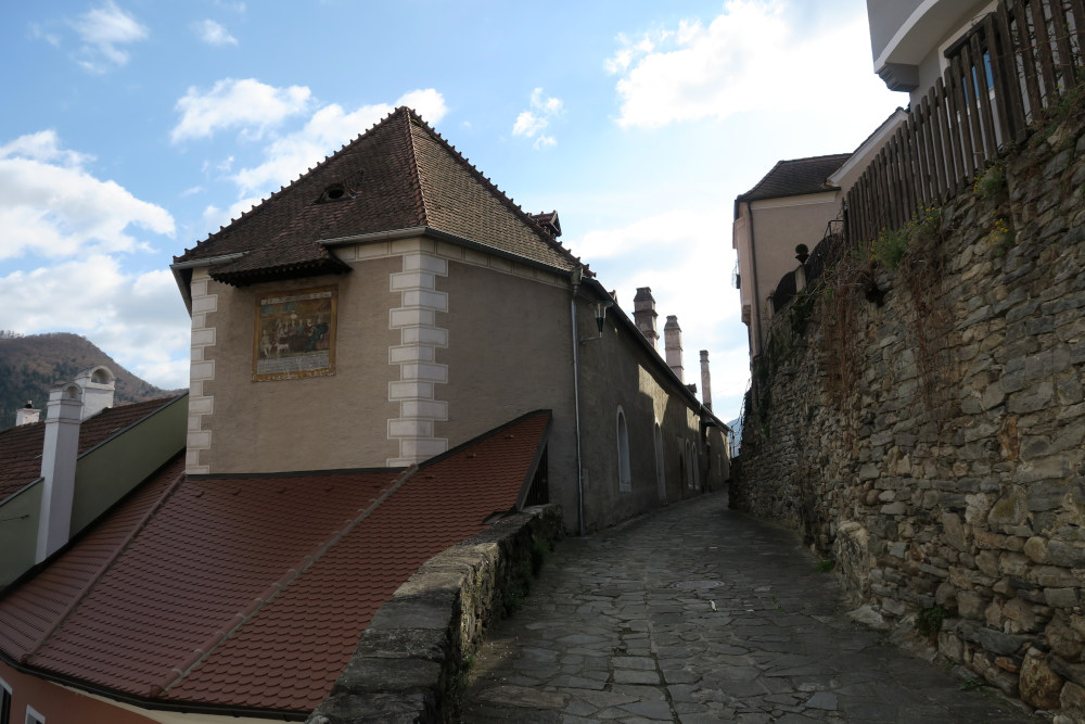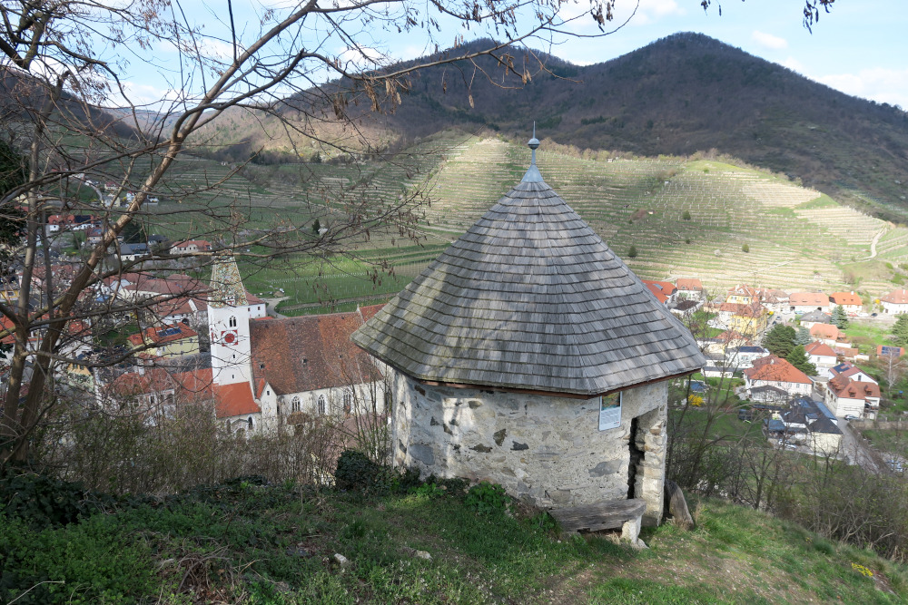 Die Anfahrt verlief erstaunlich störungsfrei und ich konnte um kurz vor zehn in Spitz an der Donau weggehen. Zuerst mäßig ansteigend durch den Ortskern mit der gotischen Pfarrkirche und dann dem Wegweiser „Buchberg Runde“ folgend.