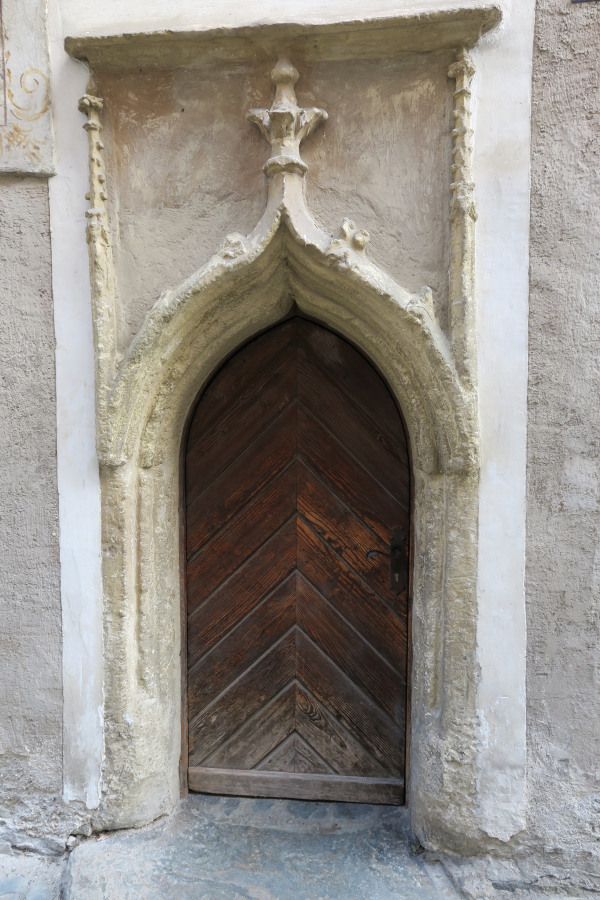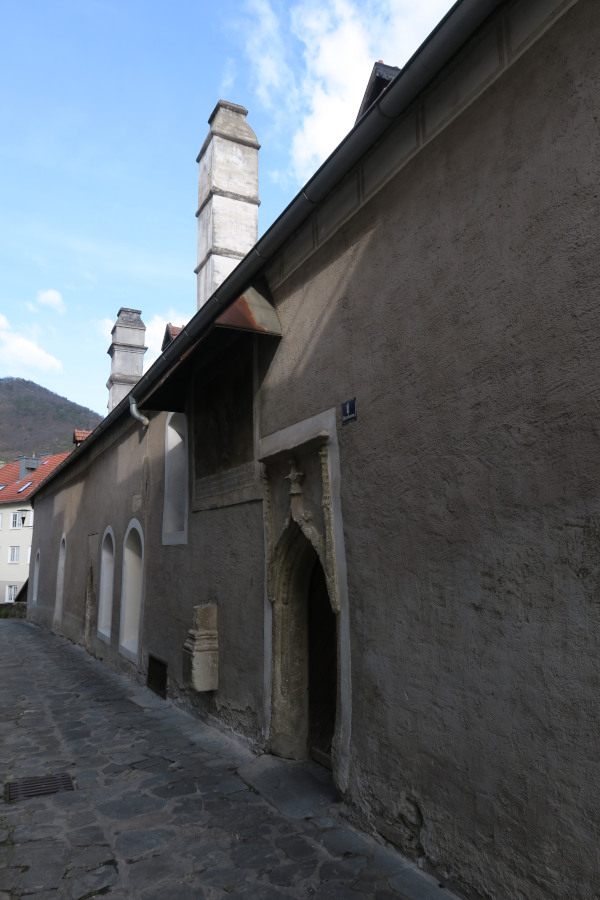 Von Süden ist der Gesamtbau ebenfalls interessant – mit turmartigem Bau mit dreizinnigem Erker und steinernen gotischen Fensterstock. Rechts die ehemalige Kapelle zu den Vierzehn Nothelfern. Das genaue Alter des Gebäudes ist nach wie vor unklar, geht aber wahrscheinlich bis ins 14. Jahrhundert zurück. Im Jahr 1419 wurde es erstmals urkundlich als Bürgerspital erwähnt. Der polygonale Abschluss erinnert nicht zu Unrecht an einen kirchlichen Chor, die Kapelle existierte bis zum Jahr 1789 – weitere Infos in dieser Diplomarbeit der TU Wien (Bernarda Ehrenhöfer 2024).