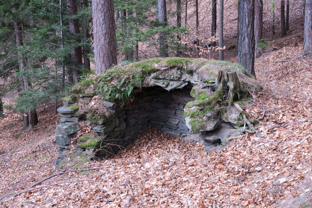 Den selben Weg zurück und dann über zwei markante Forstwegkehren hinauf zur Bärenwand (ca. 732m), einem ausgeprägten Granitfelsen mit einer winzigen Jagdhütte, vor der ein Holzbankerl steht.