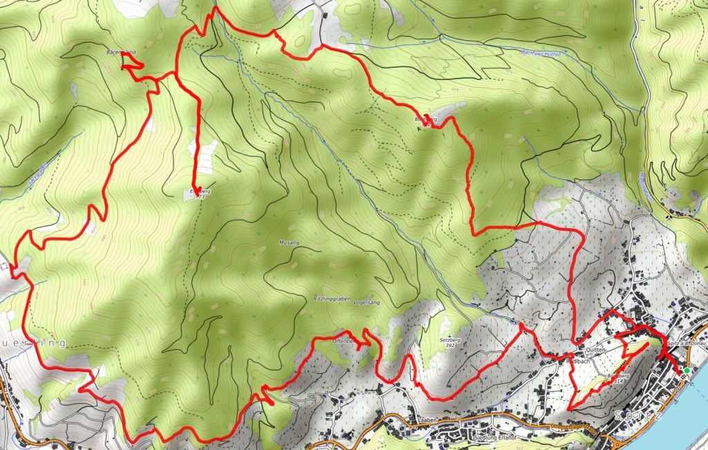 Wegführung: Spitz an der Donau Fähre Hst. (9.55) – Buchberg (702m, 11.05) – Eichberg (774m, 12.00) – Bärenwand (732m, 12.25-12.50) – Weinbergweg – Tausendeimerberg/Burgberg (314m, 15.30) – Spitz an der Donau Fähre (16.20)