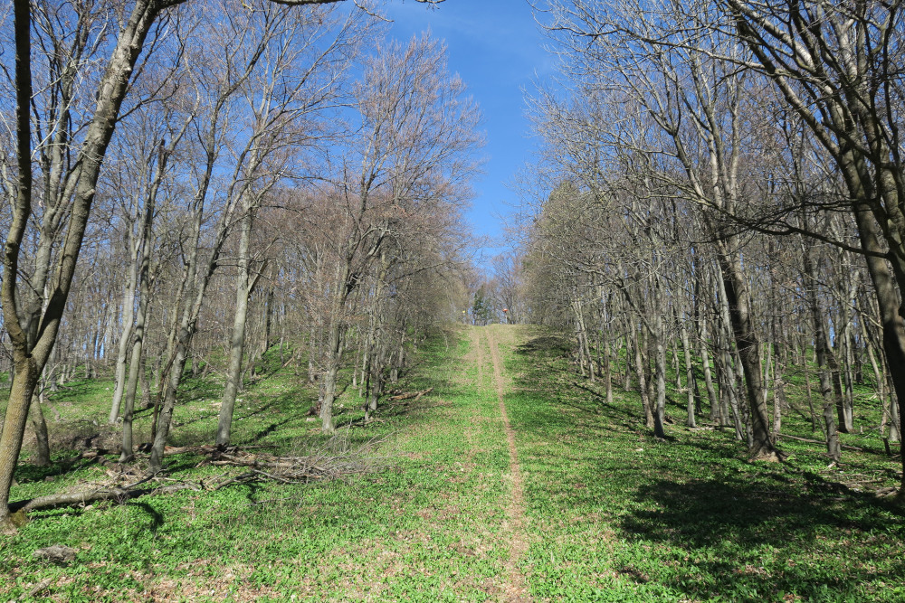 Dahinter am ursprünglich anvisierten Forstweg über die Schneise der Gasleitung steil hinauf.