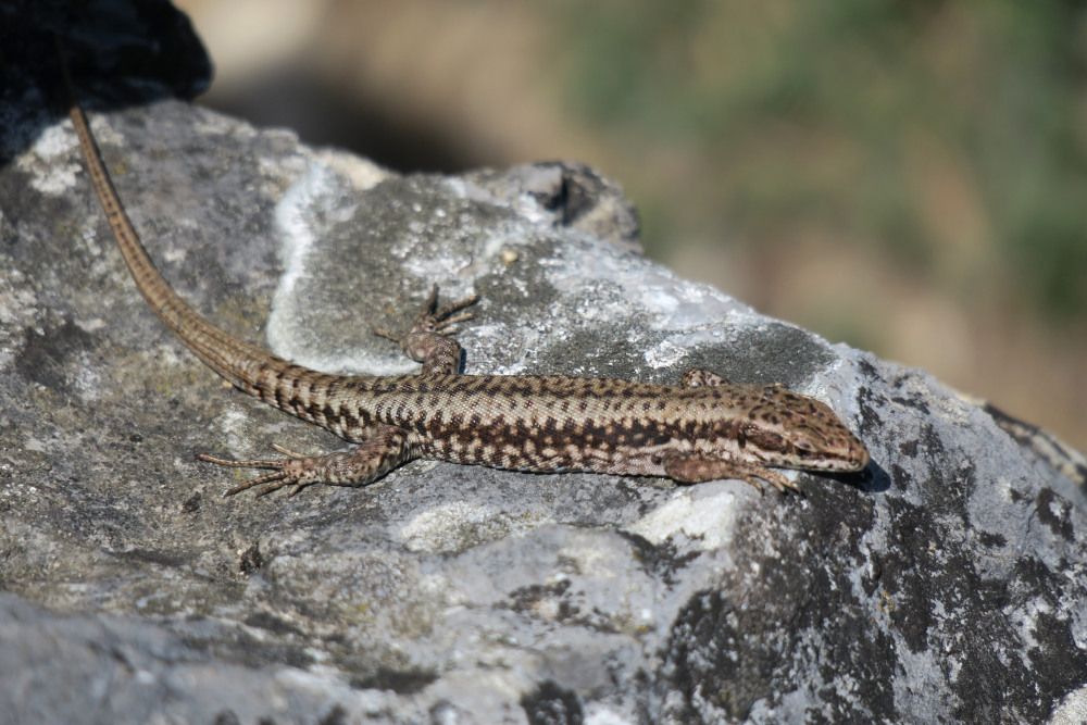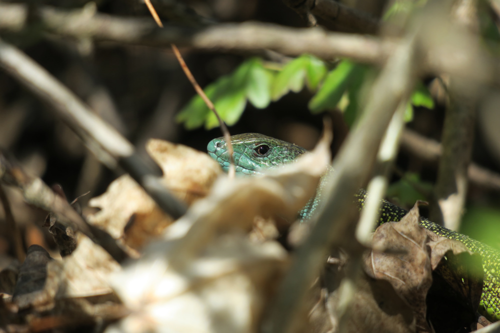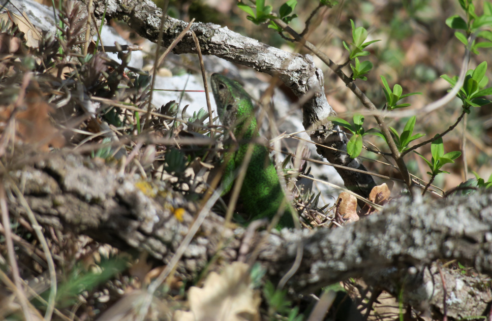 Ab dem Steinbruch füllten sich leider die Wanderwege mit den ersten Verdauungsspaziergängern. Warum leider? Sie vertrieben mir die Östlichen Smaragdeidechsen an der sonnigen Böschung. Immerhin reichte es für den Kopf: