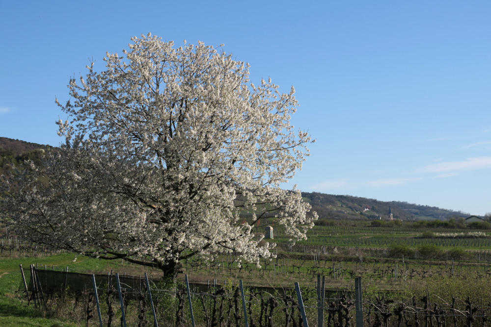 Nach dem Nachtdienst fuhr ich direkt nach Pfaffstätten, wo ich entsprechend früh startete. Die Luft erwärmte sich am Vormittag schon kräftig entlang der Weinberge und es wehte nur schwacher Südwind dazu. Zunächst ging ich entlang des Wasserleitungswegs Richtung Gumpoldskirchen weiter.