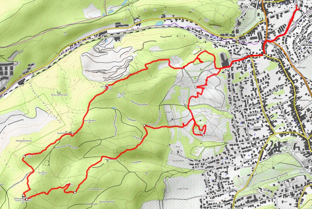 Wegführung: Rodaun – Perchtoldsdorfer Heide – Kleine Heide – Hohe Mais – Josefswarte/Kammersteinerhütte – Parapluieberg – Bierhäuslberg – Rodaun