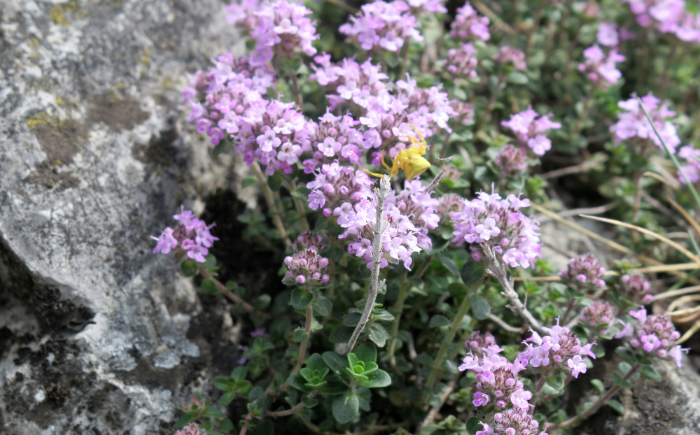 Tierisch ging es aber auch oberirdisch weiter, denn am Fuß des Schlossbergs fotografierte ich eine „Veränderliche Krabbenspinne“ (Misumena vatia) in einem Thymian-Gewächs. Die Spinne entdeckte ich erst zuhause am Foto. Die auffallende gelbe Farbe deutet auf ein Weibchen hin, die in der Lage sind, ihre Körperfarbe der Blütenfarbe anzupassen, was diesem Weibchen offensichtlich leidlich gelungen ist.