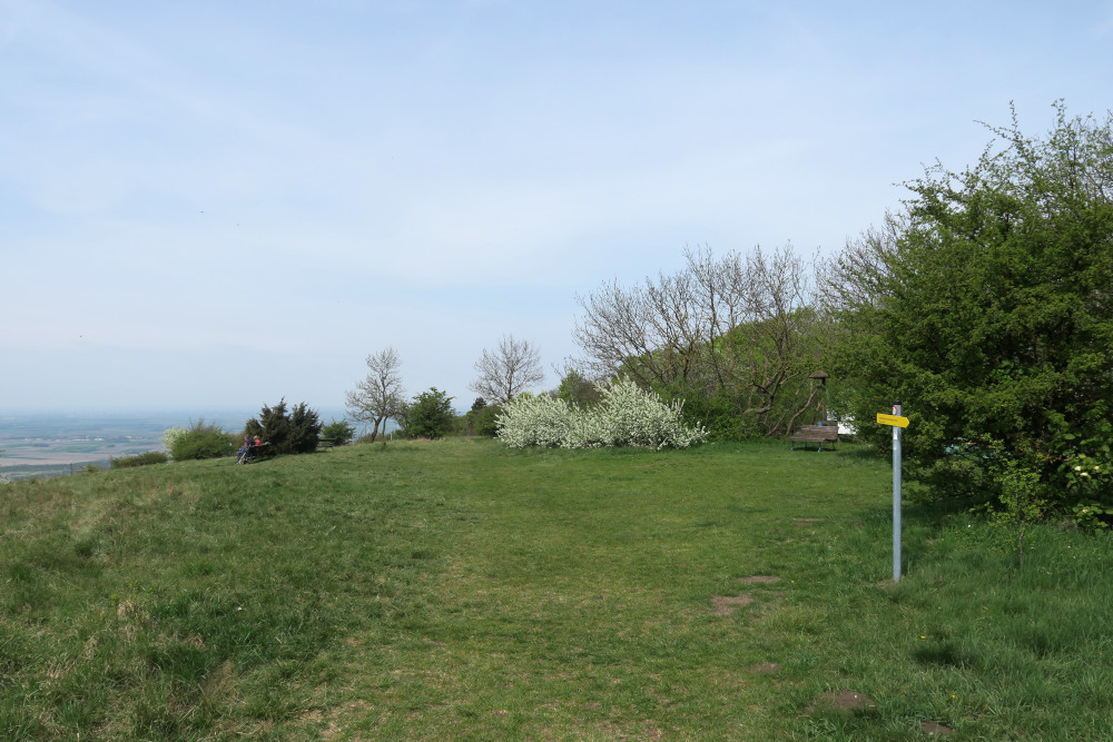 Beim Gipfel wollte ich nun eigentlich länger gemütlich rasten, doch die Hütte war geöffnet und eine große Gruppe plauderte sehr angeregt und laut. Das ältere Paar auf der Bank links kommentierte das lakonisch. Der Mann sinngemäß: „Das ist kein Ort zum länger Verweilen.“ und die Frau: „Man hat das Gefühl, es sind nur Wiener hier.“ Ich schmunzelte auf der anderen Seite des Gebüschs.