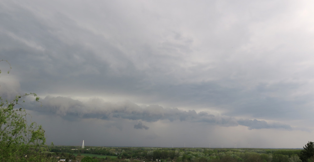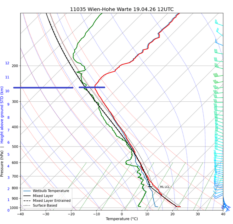 Die ausgemessenen Wolkenobergrenzentemperaturen um -55°C zeigten, dass die Gewitterwolken bis zur Tropopause reichten, also über 10km hoch (ca. FL330). Das war bereits beachtlich für Mitte April. Die Schichtung zeigte einen typischen „skinny CAPE“-Aufstieg mit schmaler, aber hochreichender Labilitätszone. Die Grundschicht war gut durchmischt bis etwa 2km Höhe, was förderlich für Verdunstungskälte und dadurch beschleunigte Abwinde war. Bodennah rückdrehende Südostwinde und darüber moderate Westwinde ermöglichten organisierte Gewitter, durch den frontalen Hebungantrieb linienförmige Konvektion begünstigend.