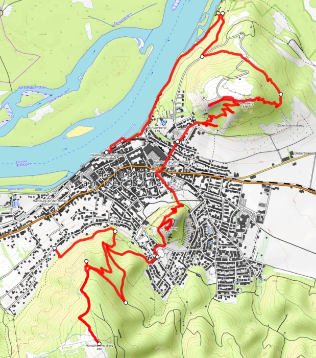 Wegführung: Hainburg a.d. Donau Personenbahnhof (9.25) – Ruine Röthelstein – Keltenweg – Rundwanderweg – Keltenweg – Braunsberg (10.45) – Schlossberg (11.50) – Hundsheimer Berg (13.10) – Carnuntumstraße (14.05)