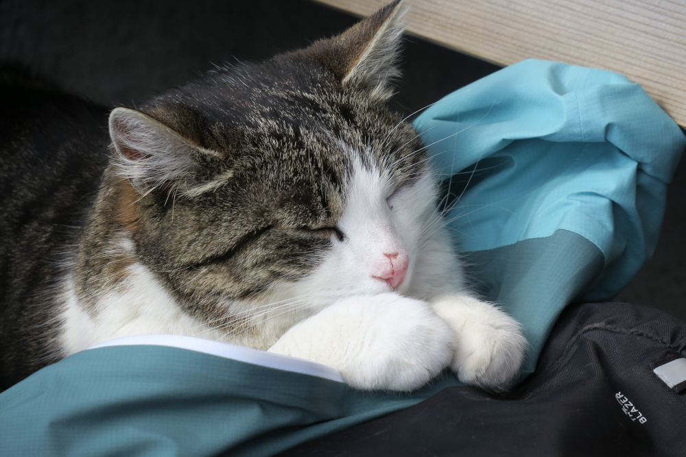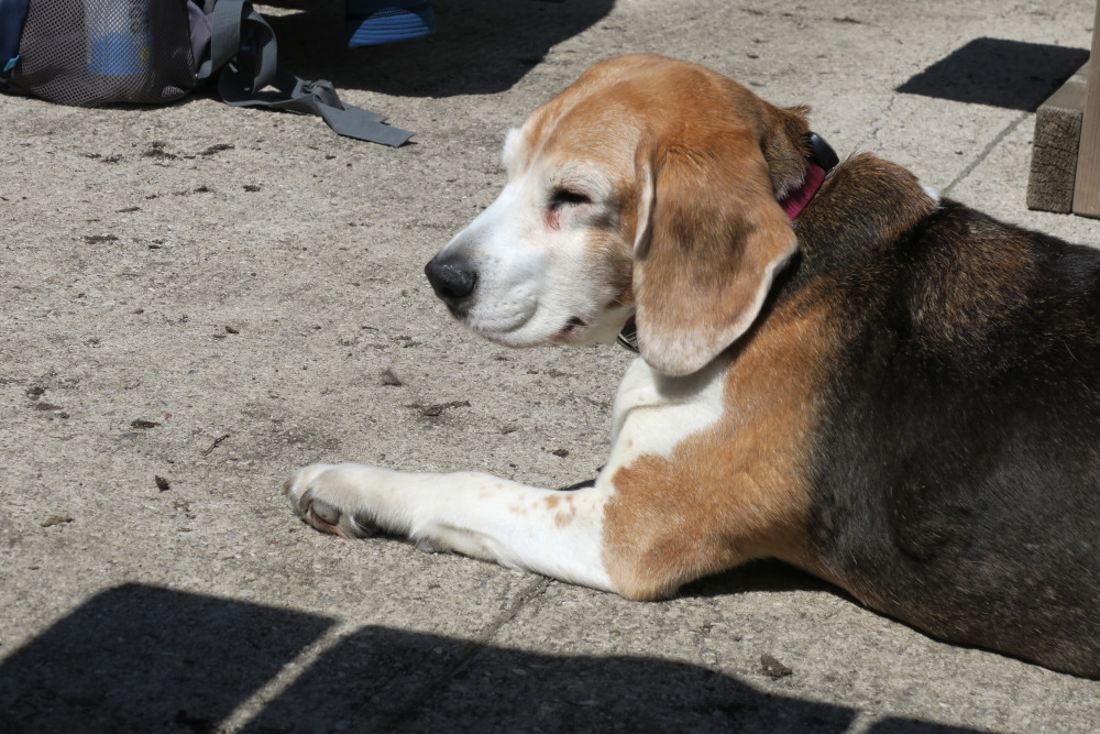 Von den drei Hüttenkatzen zeigte sich nur eine, die am gegenüberliegenden Tisch entlang ging. Neben uns stand eine sechs Jahre alte Australien Shephard Hündin, die die Katze neugierig anstarrte. Diese verkroch sich hinter zwei Frauen und blieb auch dort liegen, als der Hund längst weg war.