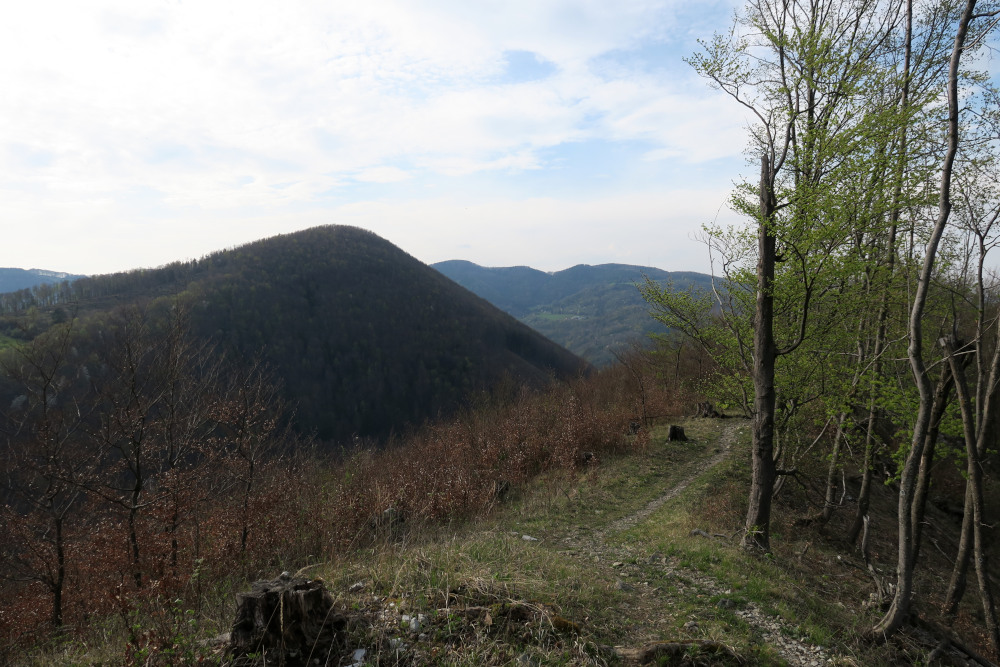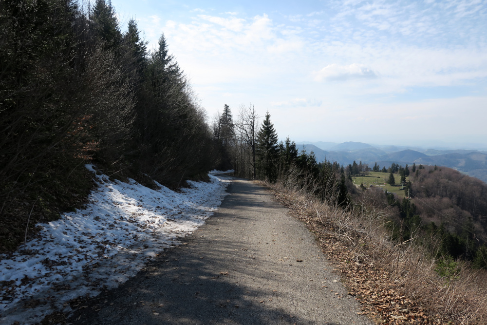 Die meisten Forstwegkehren lassen sich über einen alten Ziehweg abkürzen, nur weiter oben lagen Baumstämme am Weg und ein (ungültiges) Schild zu Forstarbeiten, mit Uhrzeit, aber ohne Datum. Wir gingen trotzdem lieber außen herum, falls etwaige Hindernisse im Weg liegen würden.