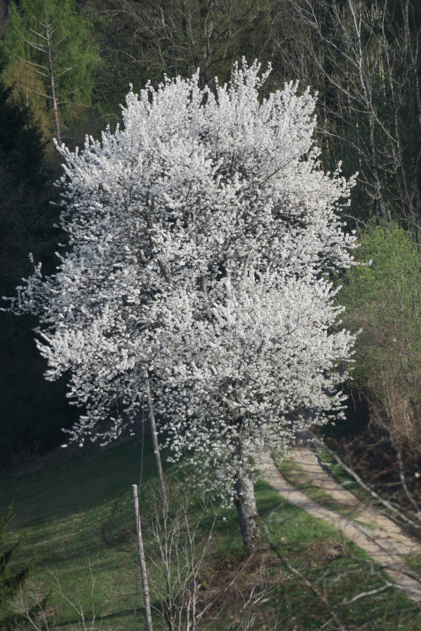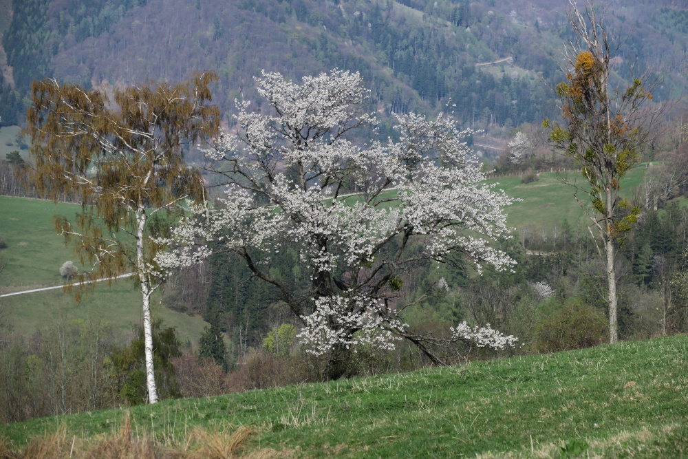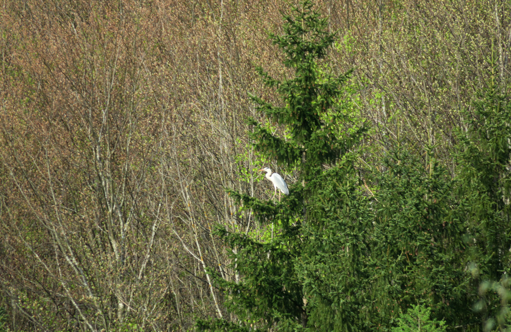 Dann flog ein großer Vogel, ich hielt ihn zuerst für einen Storch, über den Talboden und setzte sich auf einen hohen Nadelbaum am Hang: