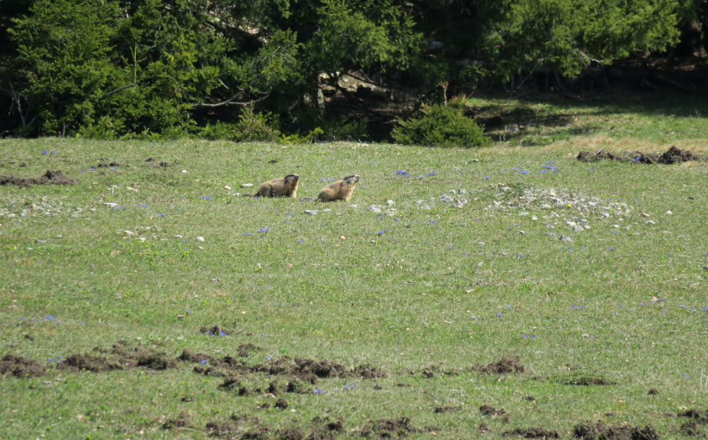 Bisher wusste ich von Murmeltieren in Richtung Schwarzwaldeck und Hochstaff, aber dass es sie auf der Sternleiten der Hinteralm gab, war uns beiden neu. Von der Anzahl der ausgehobenen Erdhügel her lebte hier mindestens ein Dutzend Murmeltiere, eher mehr und weiter nordwestlich gab es eine zweite Population.