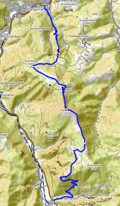 Route: Innerfahrafeld Dürntal Hst. (10.10) – Talerhütte (11.35-12.00) – Kandlhofalm (12.30) – Hinteralm (1313m, 14-15.15) – Muckenkogel (1248m, 15.40) – Kolm (16.50) – Mitterriegel – Lilienfeld (18.00)