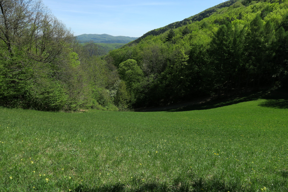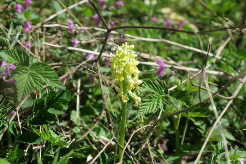 Er mündete nordöstlich vom Allandriegel (682m) in einen Forstweg. Kurz darauf stand ich bei den laut Karte „Orchideenwiesen“. Es blühten jede Menge Himmelsschlüsseln (Primula veris) und einzelne Trauben-Hyazinthen. Für Orchideen war der Boden offenbar noch zu kalt. Weiter oben hatte ich noch einzelne verblühte Schneerosen gesehen. Er heißt halt nicht umsonst „Kalter Berg“.