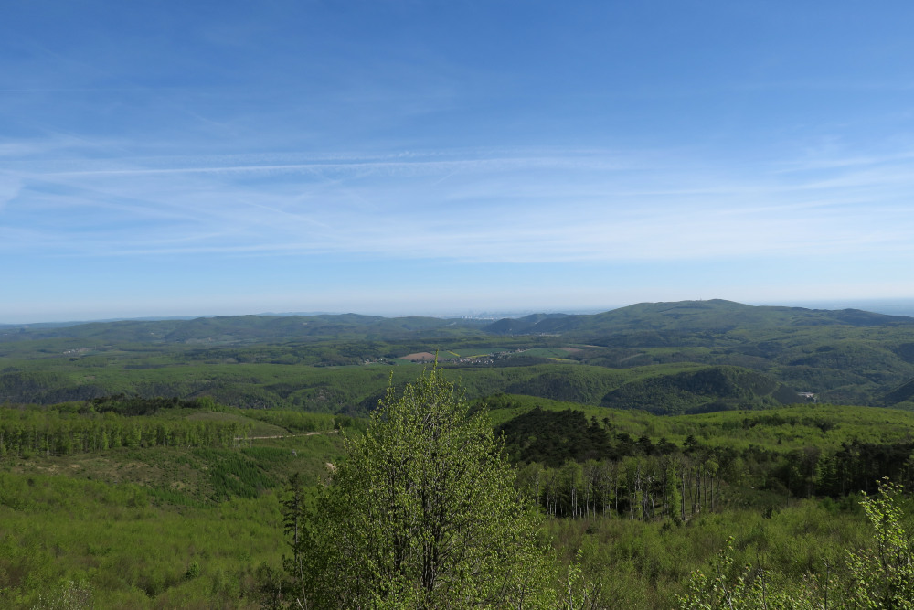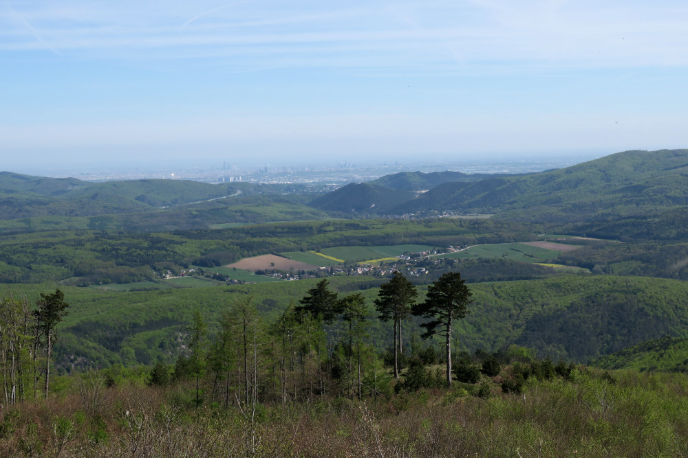Bald erreichte ich den Hochstand mit der Aussicht neben dem markierten Anstieg. Dieses Platzerl musste ich einfach jedes Mal besuchen. Die Wiener Skyline war erkennbar – weiter nach Osten war der Dunst zu mächtig.