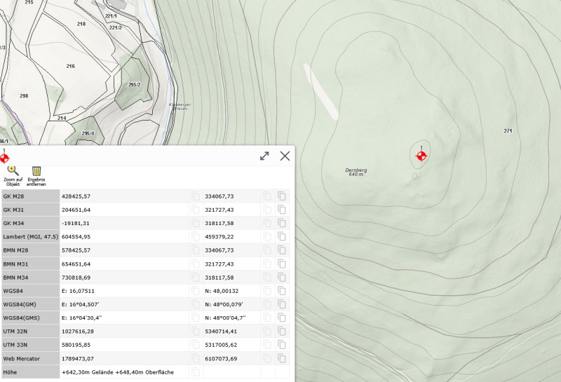 In allen Karten steht beim Dernberg 640m Höhe dabei. Laut AMAP befand sich der Gipfelpunkt dort, wo ich gestanden war. Das war allerdings nicht der höchste Punkt! Die Open Topo Karten hatten zwar den richtigen Gipfelstandort weiter östlich korrekt lokalisiert, aber mit der falschen Höhe versehen: