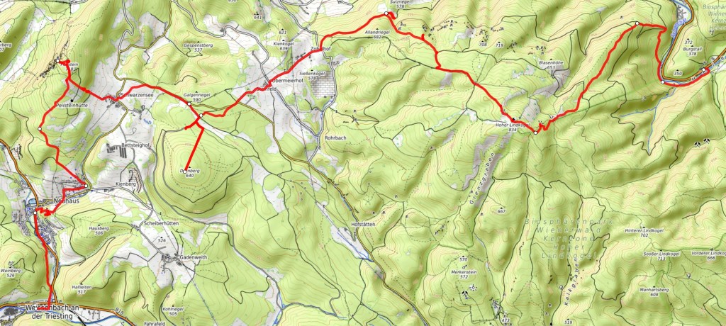Wegführung: Helenental Cholerakapelle (8.50) – Steiniger Weg – Hoher Lindkogel (834m, 10.25) – Orchideenwiese (11.10) – Zobelhof – Dernberg (640m, 12.20) – Schwarzensee (13.00) – Peilsteinhaus (716m, 13.30-15.00) – Gipfelkreuz – Burg Neuhaus (16.00) – Weissenbach an der Triesting Haltestelle (16.35)